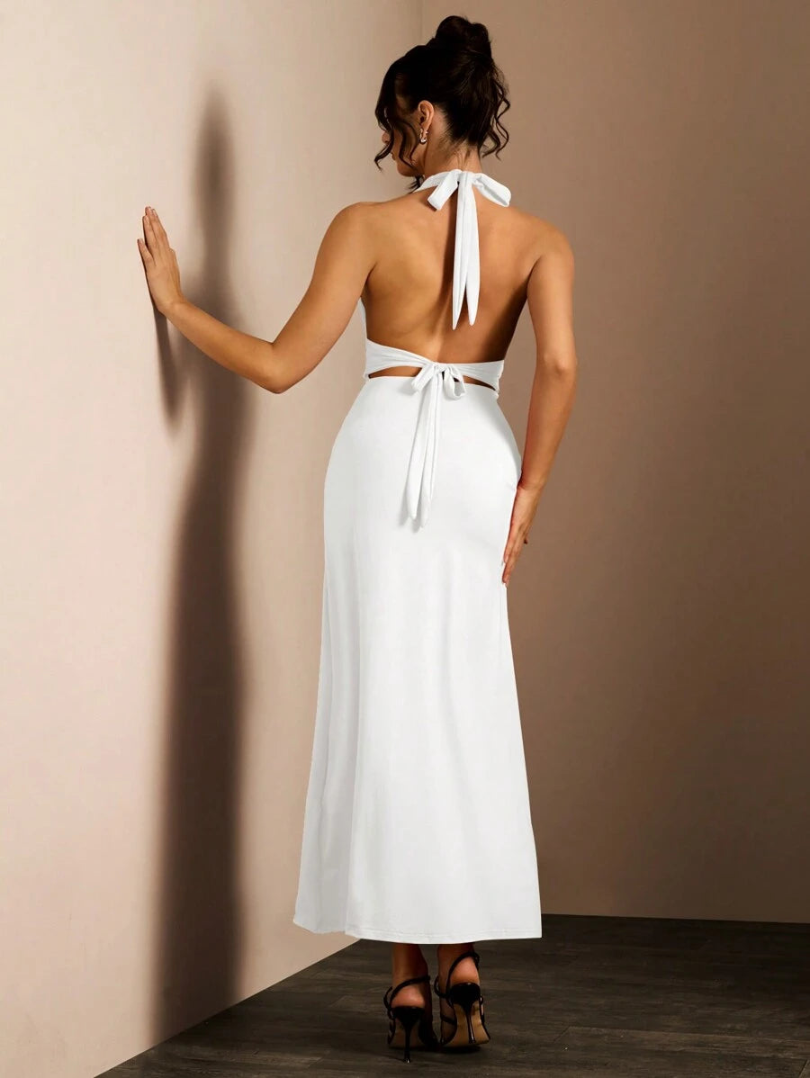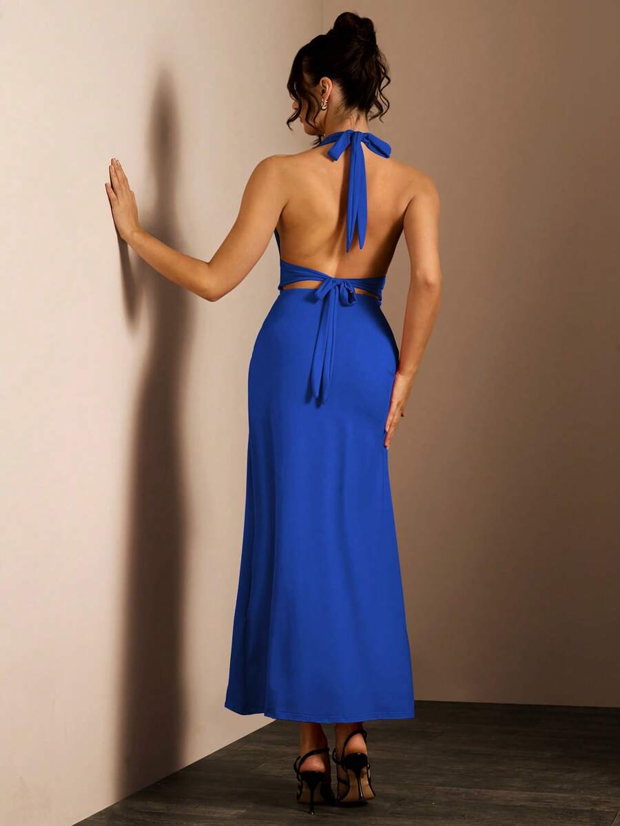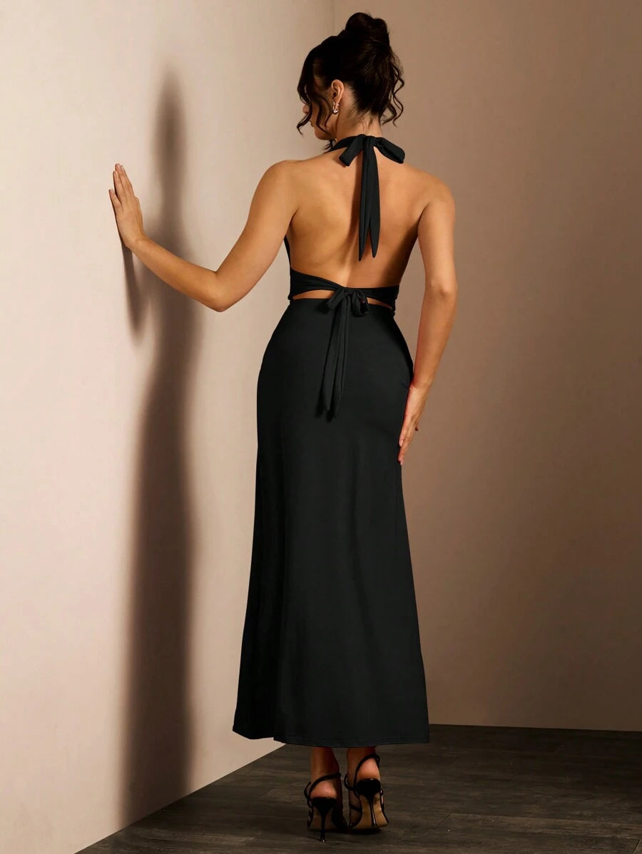 NOVOHalter Neck Backless Visoka Pregača Uska Haljina za Novogodišnje Odeće Maxi Ženski Outfit, Visoka Pregača Haljina, Podeljena Butina Haljina, Niska Orezana Haljina Halloween, Božić