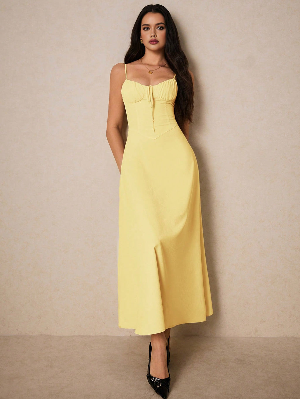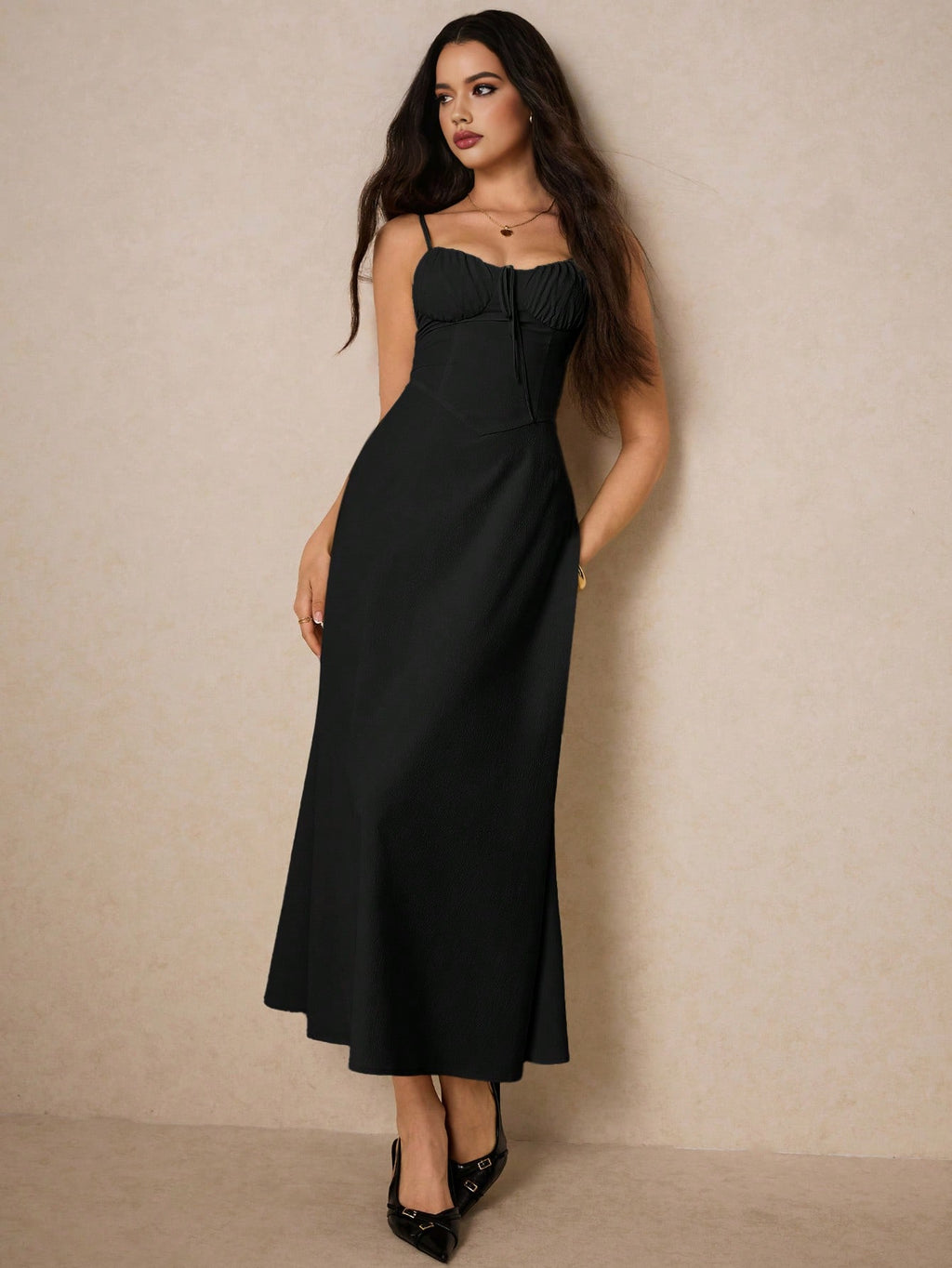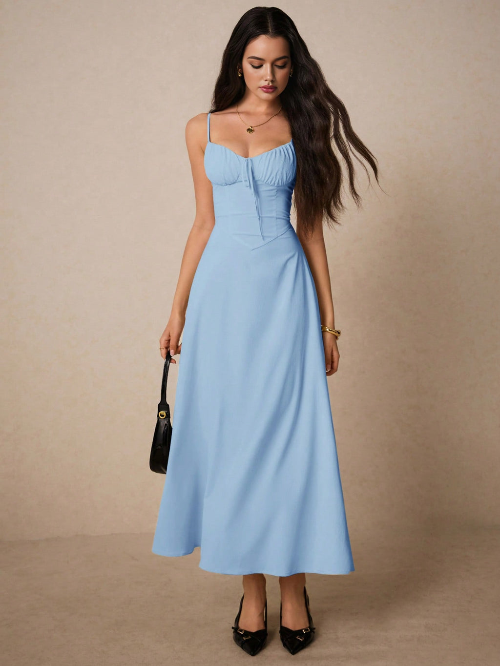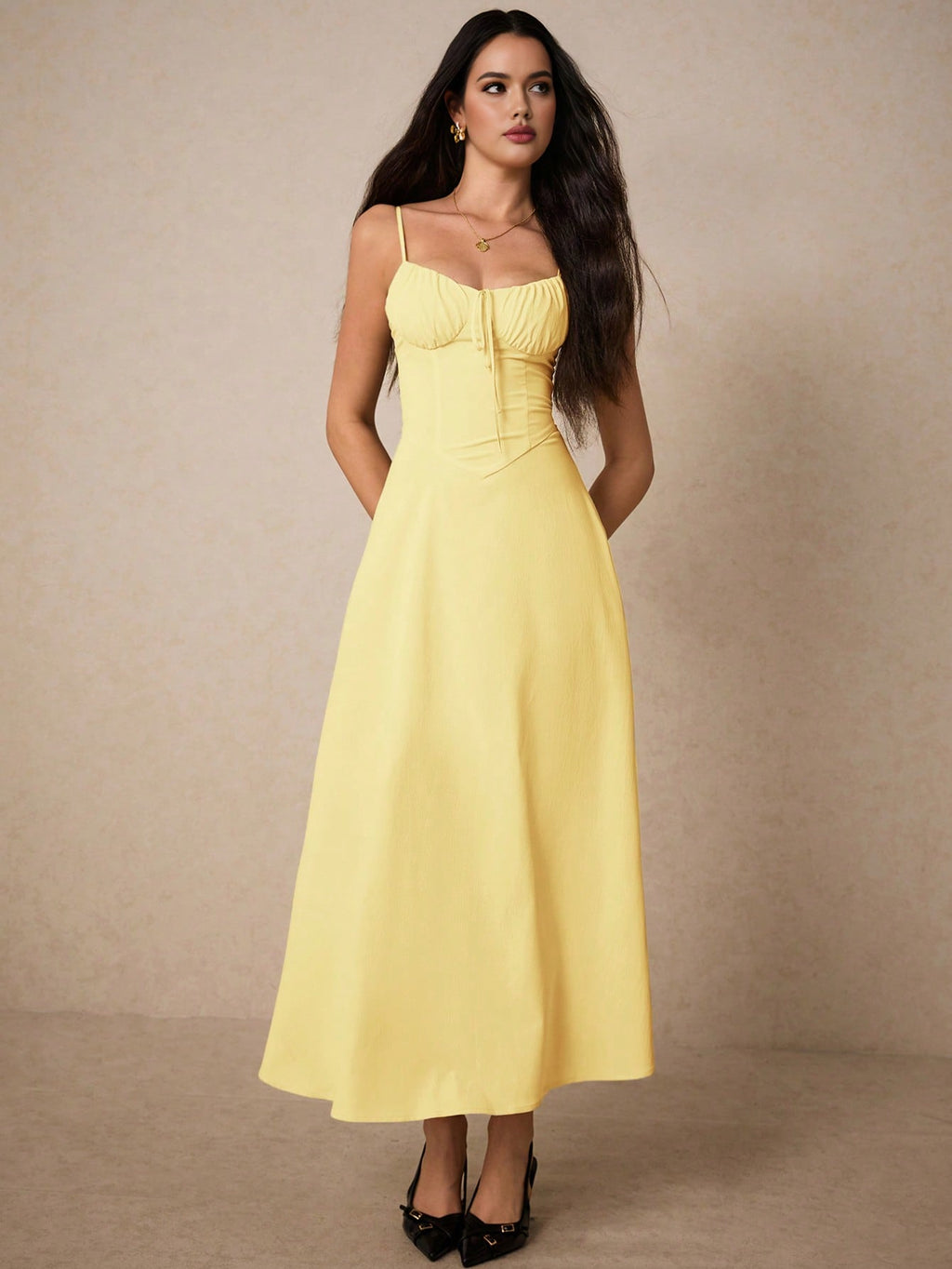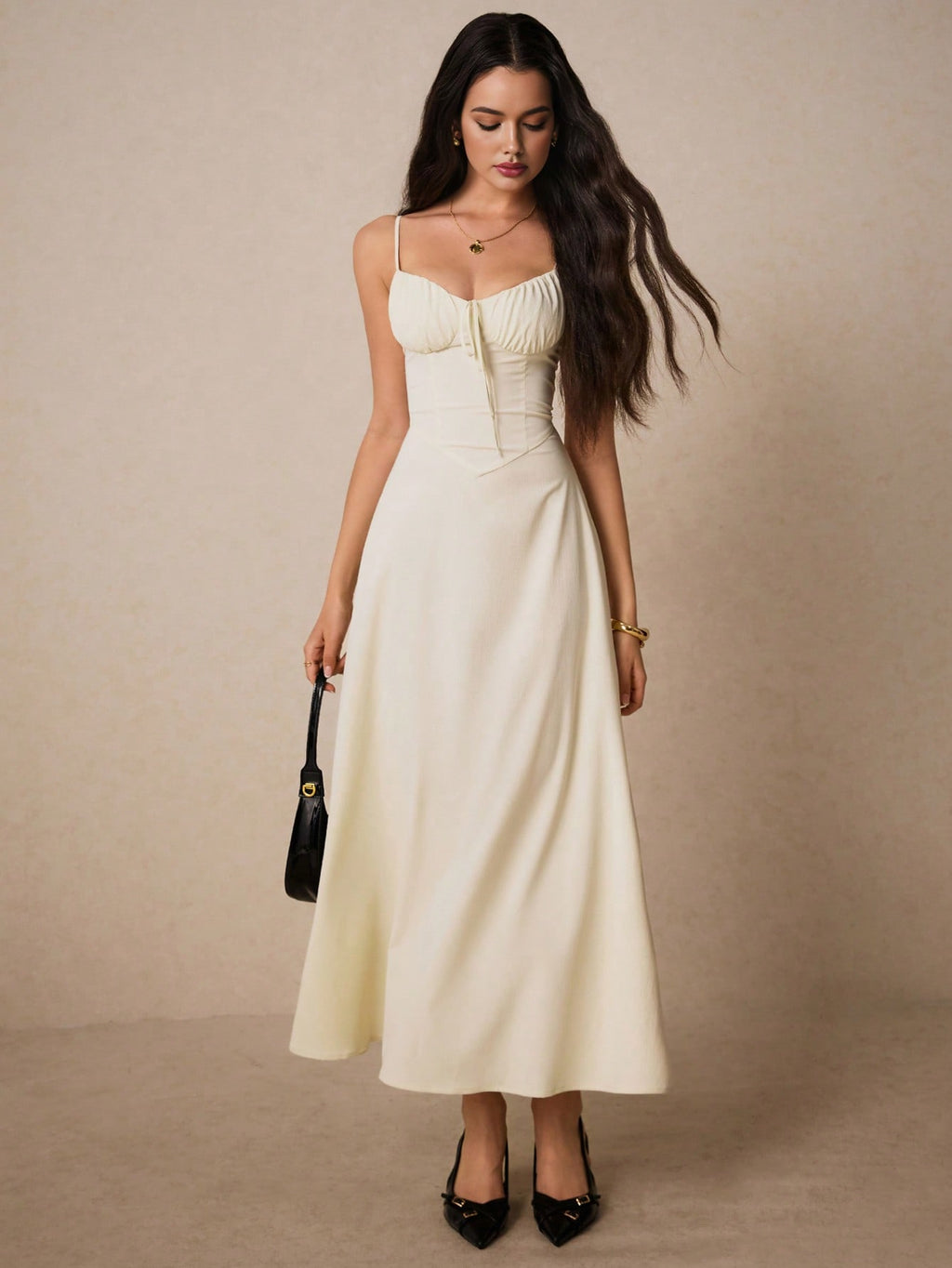 Poéselle elegantna krem maksi haljina – srcoliki izrez, volani, za vjenčanja, maturu i romantične prilike