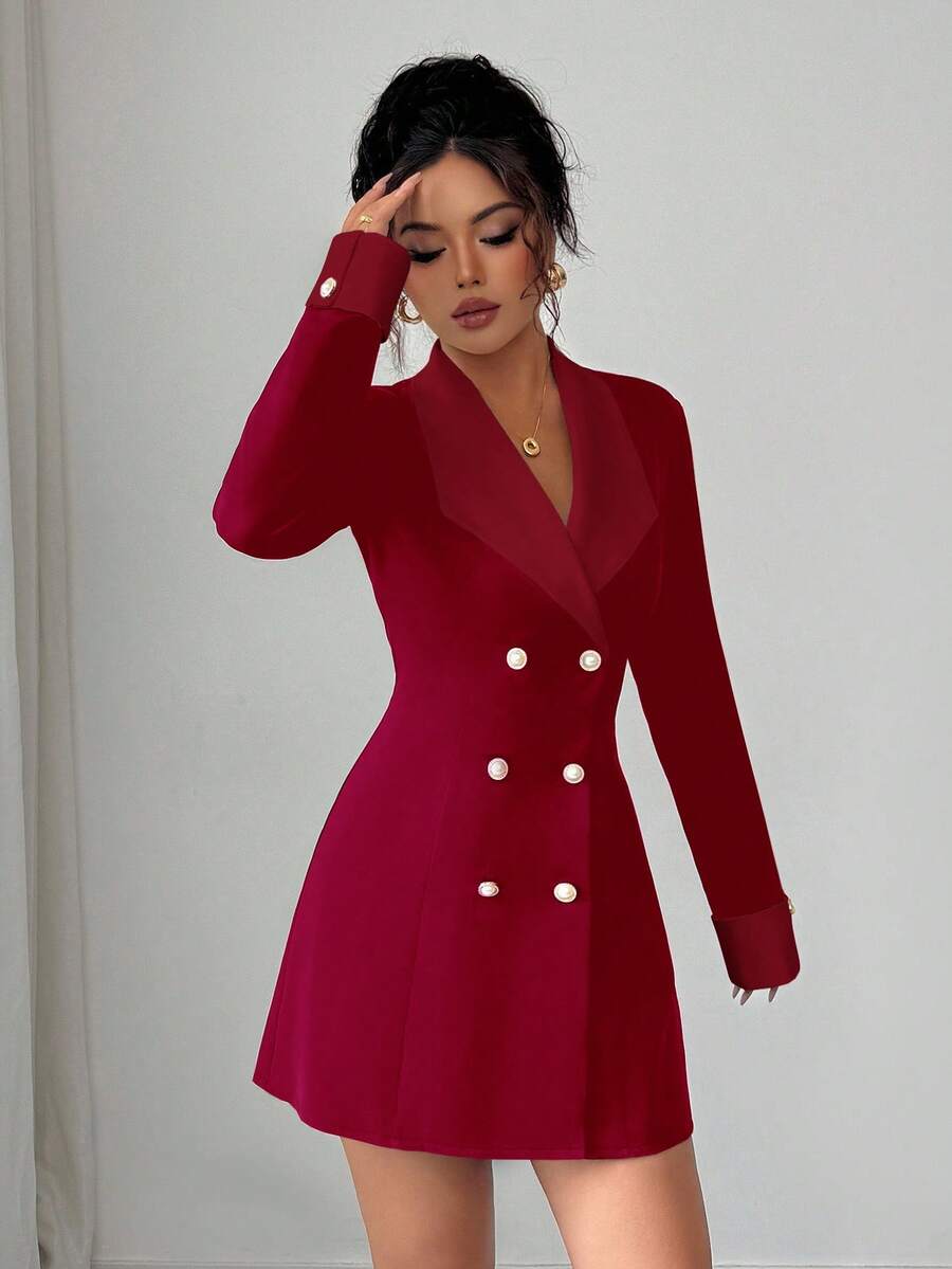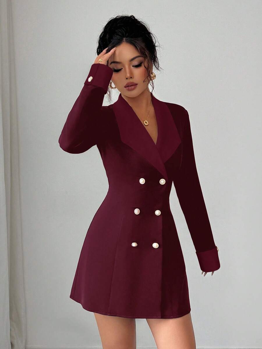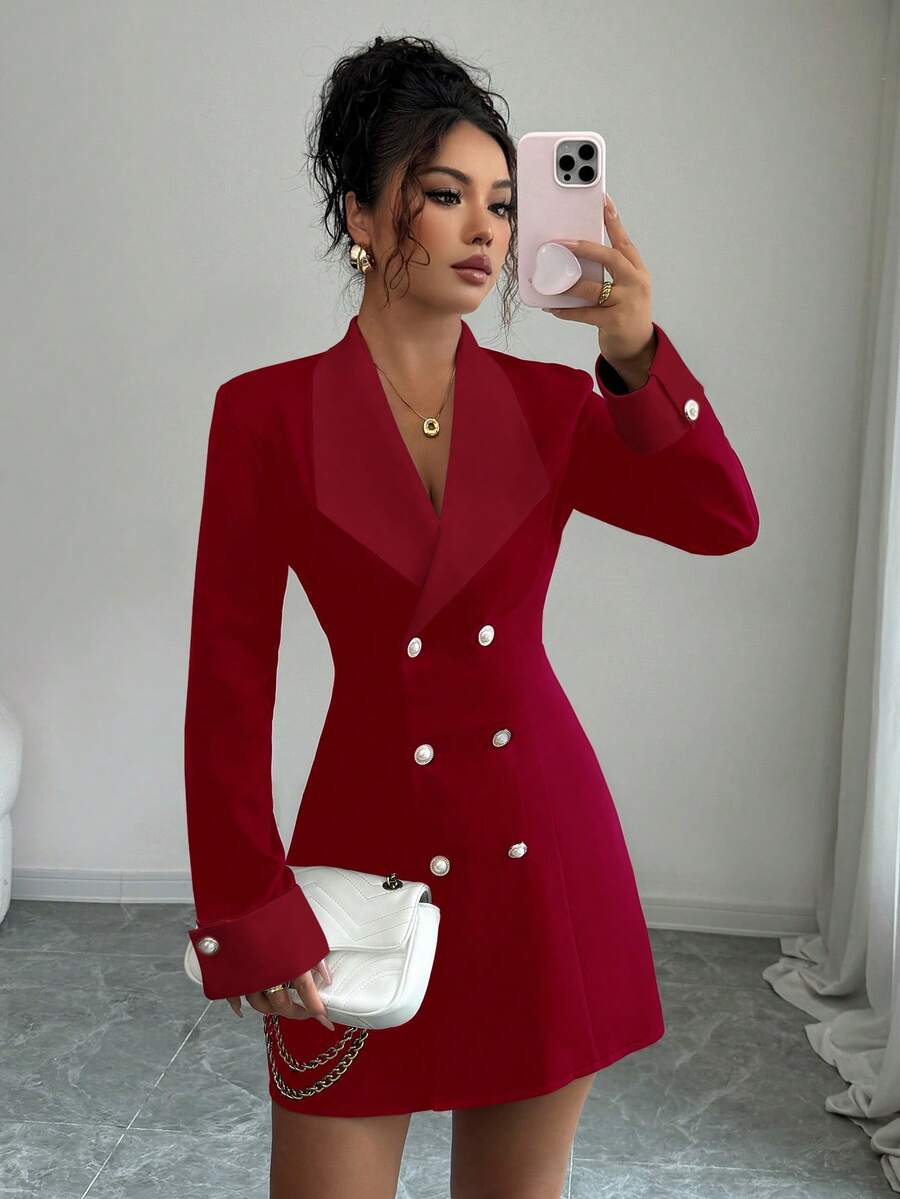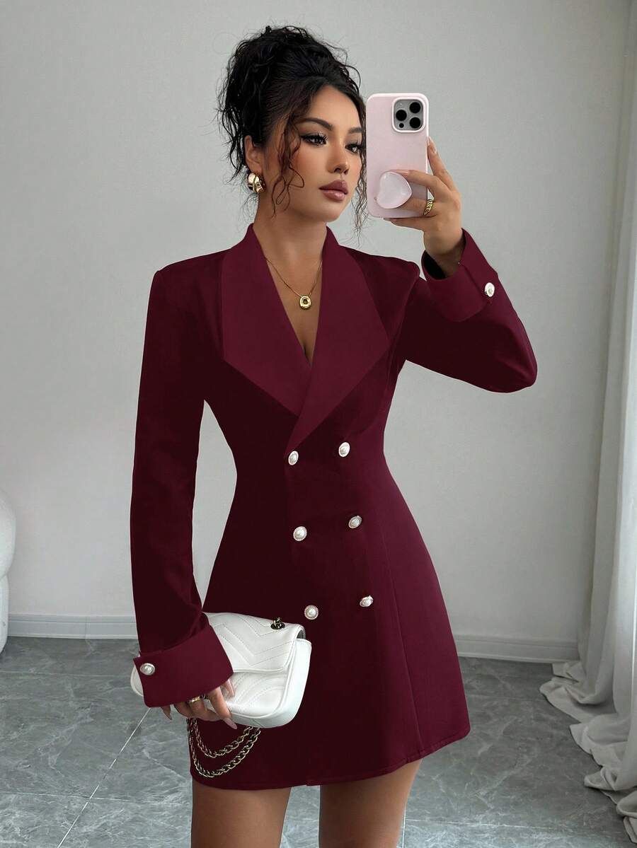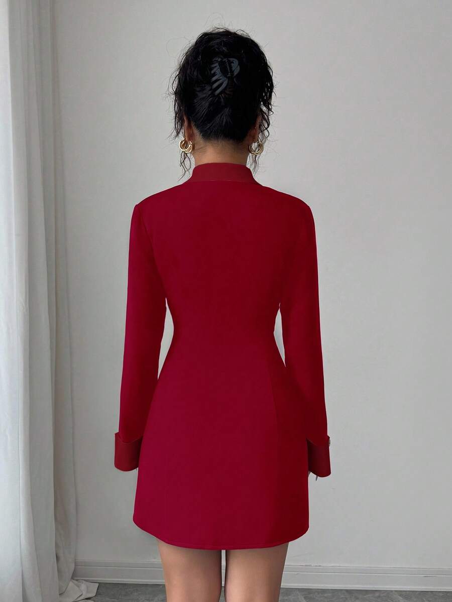 Selianne Minimalistička Claret Duga Rukava Otvoreni Prednji Dvolični Kratki Haljina, Prikladna Za Službene Večere, Okupljanja Sestara, Večernje Datume, Crvene Haljine Za Žene, Božićna Ženska Odjeća, Elegantne Haljine Za Žene, Žene Na Poslu