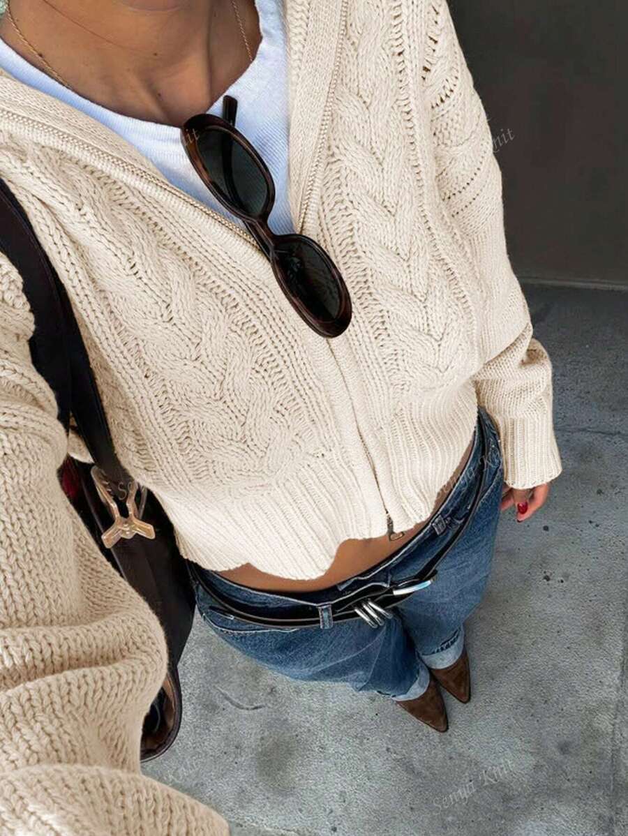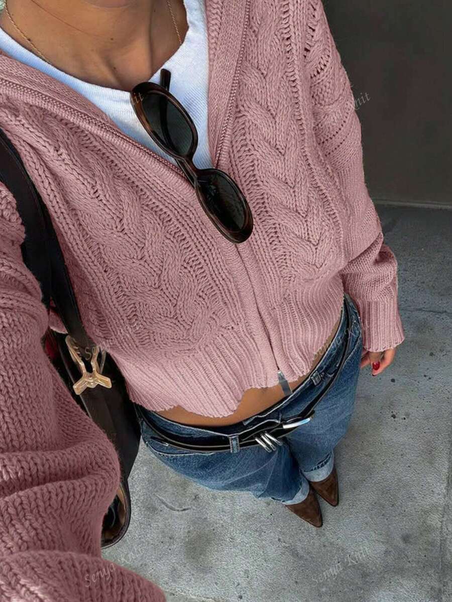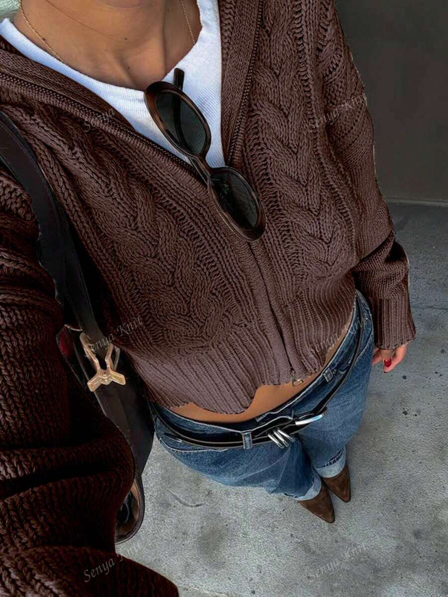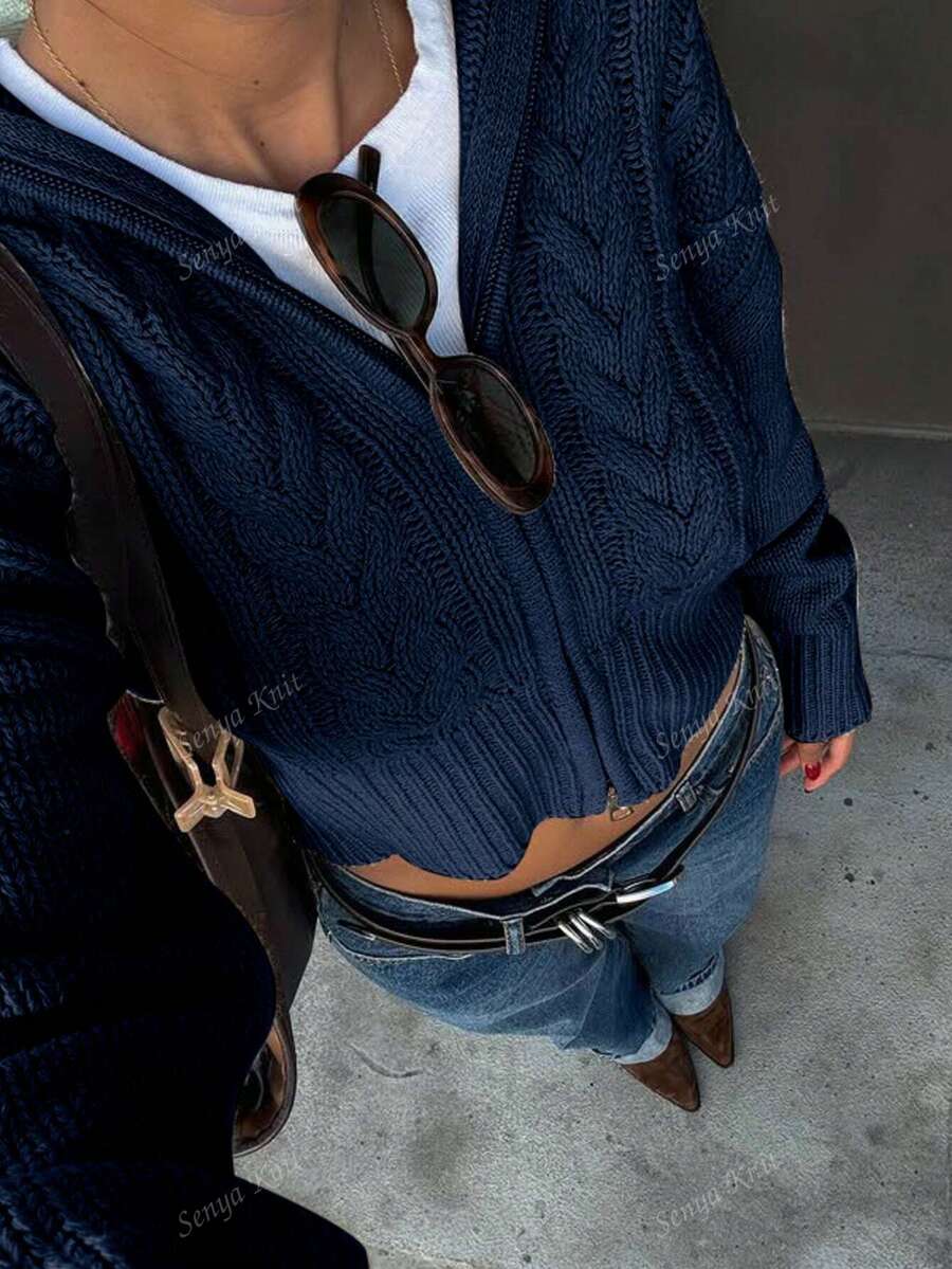 Senya Autumn And Winter New Vintage Big Lapel Double Head Zip Twisted Knit Cardigan, Loose Drop Shoulder Casual Jumper, Short Daily Commuting,Teacher,Airport Jumper Tops