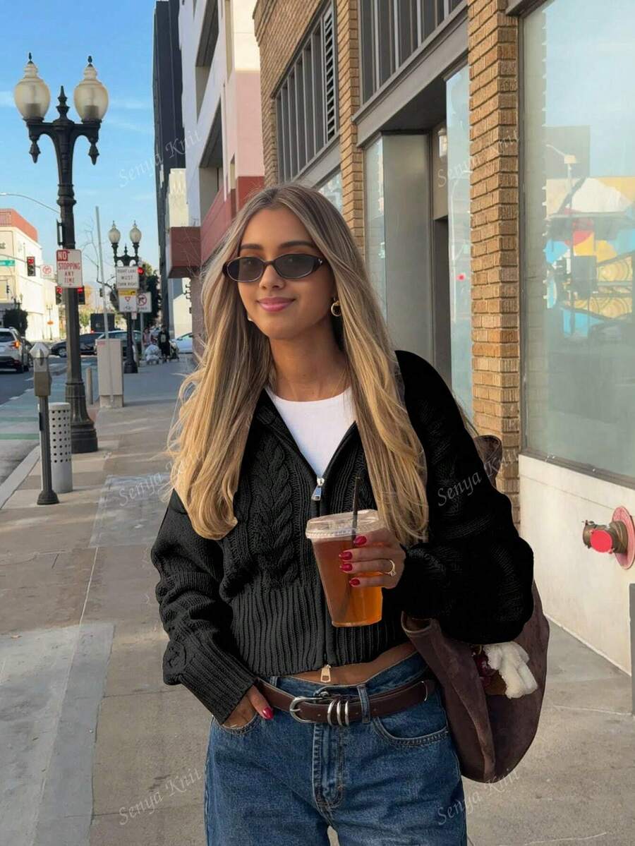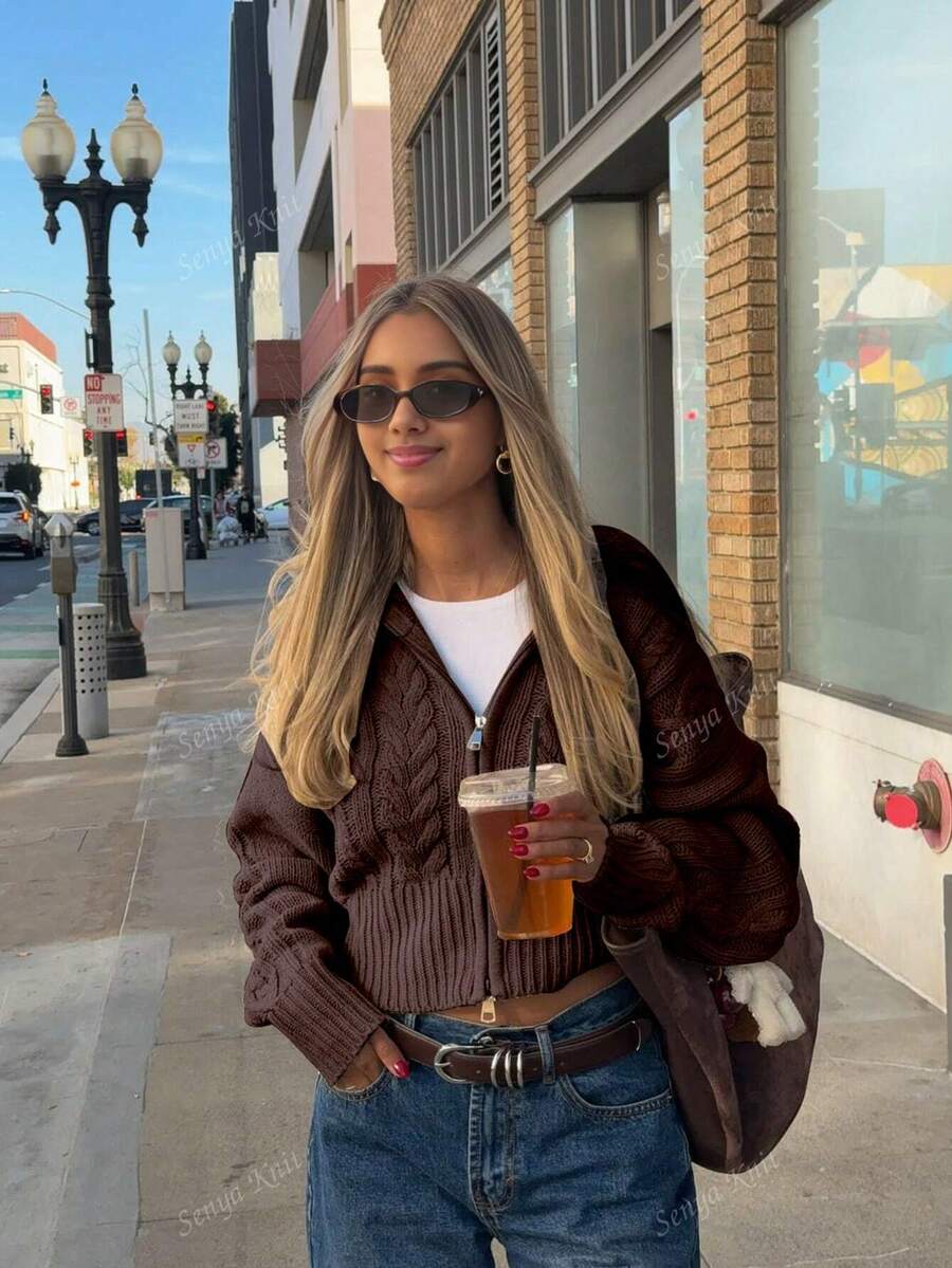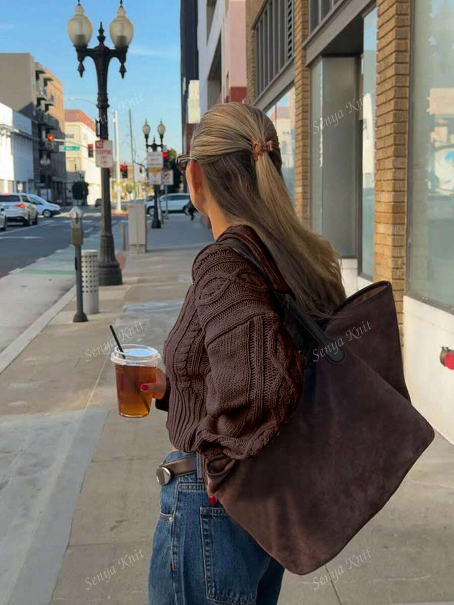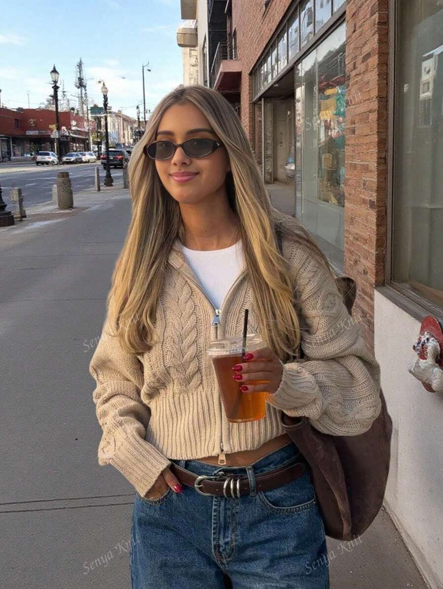 Senya Autumn And Winter New Vintage Big Lapel Double Head Zip Twisted Knit Cardigan, Loose Drop Shoulder Casual Jumper, Short Daily Commuting,Teacher,Airport Jumper Tops