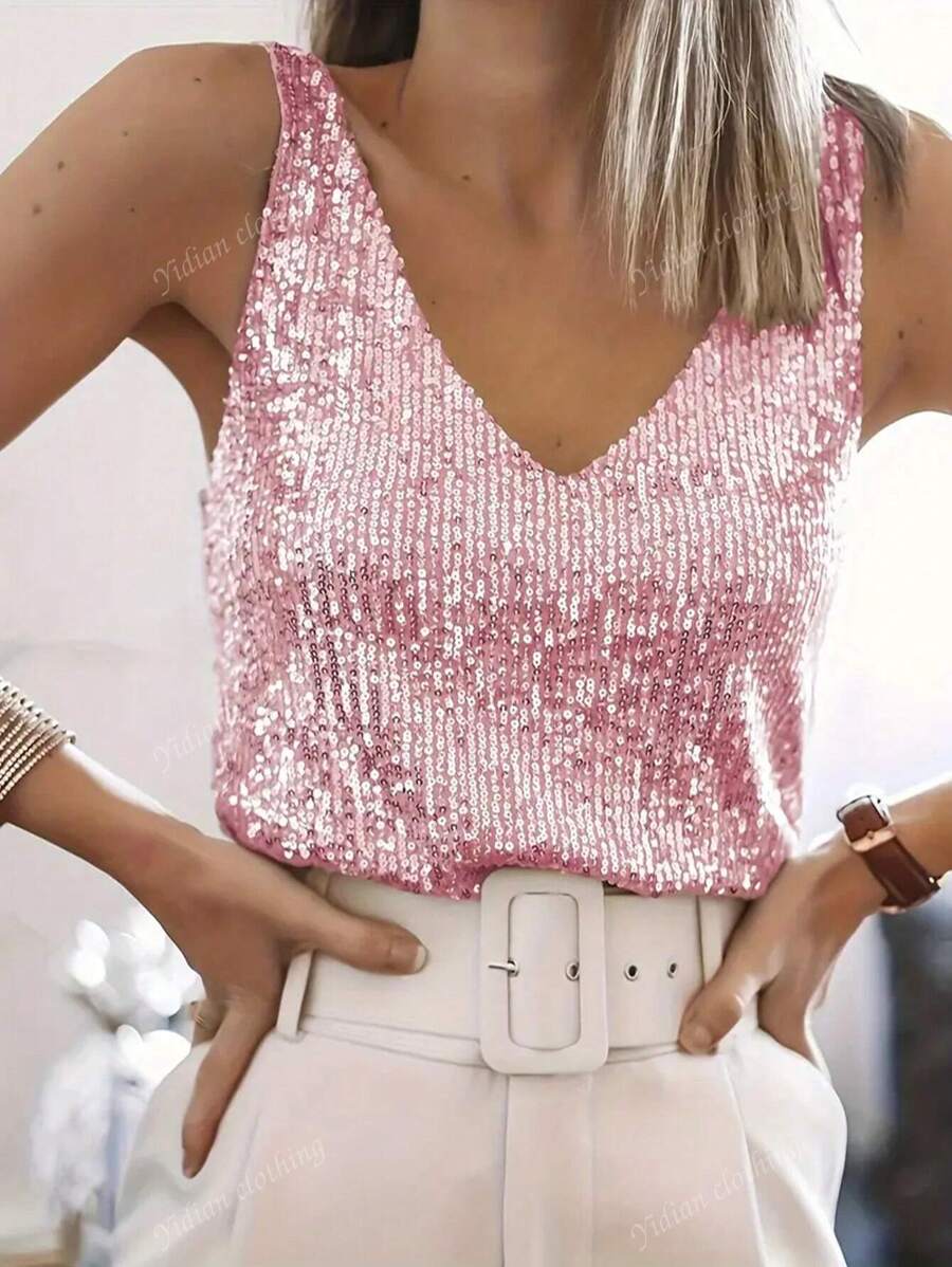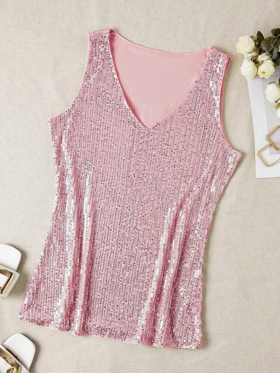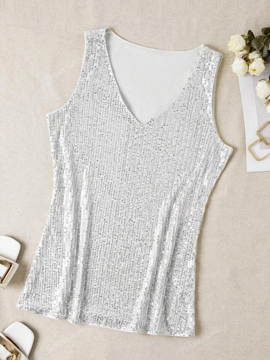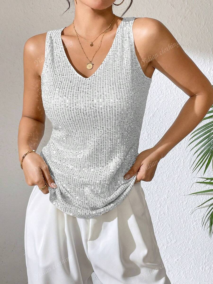 Sequin V-Neck Sleeveless Tank Top, Elegant Tank Top For Spring And Summer