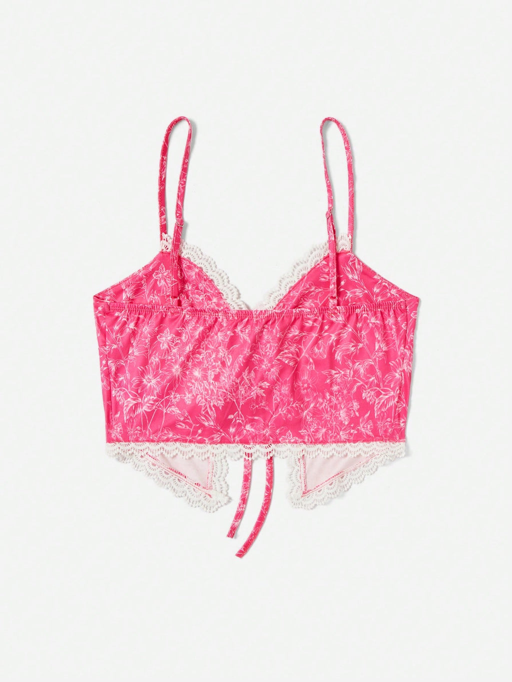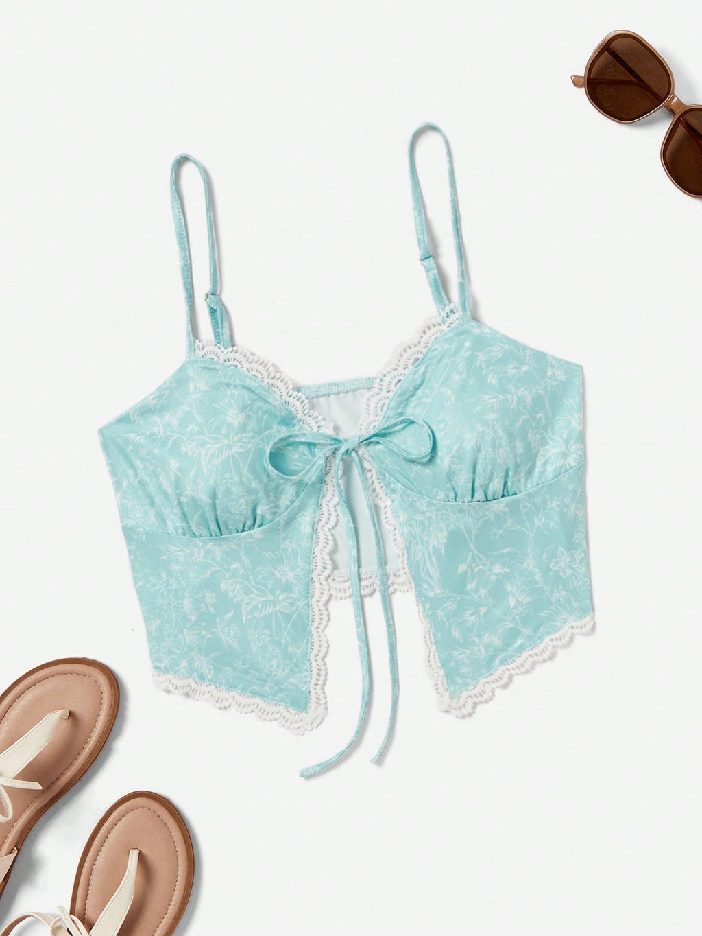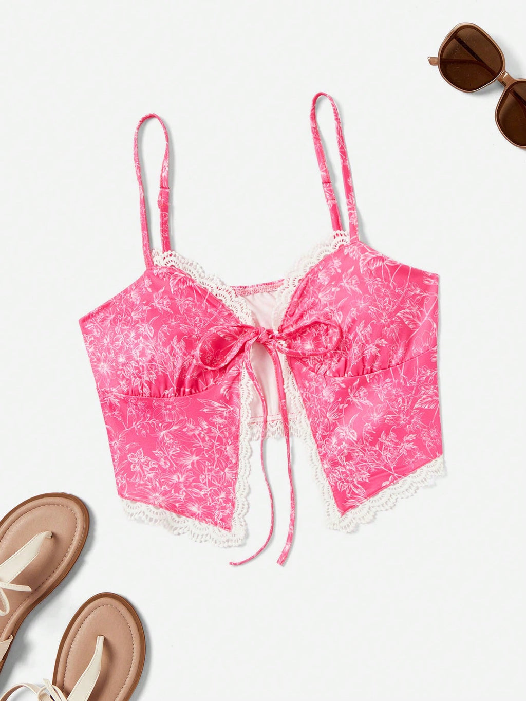 SHEIN WYWH ljetni ženski top s cvjetnim printom s kontrastnom čipkom, prednjom kravatom i podijeljenim rubom