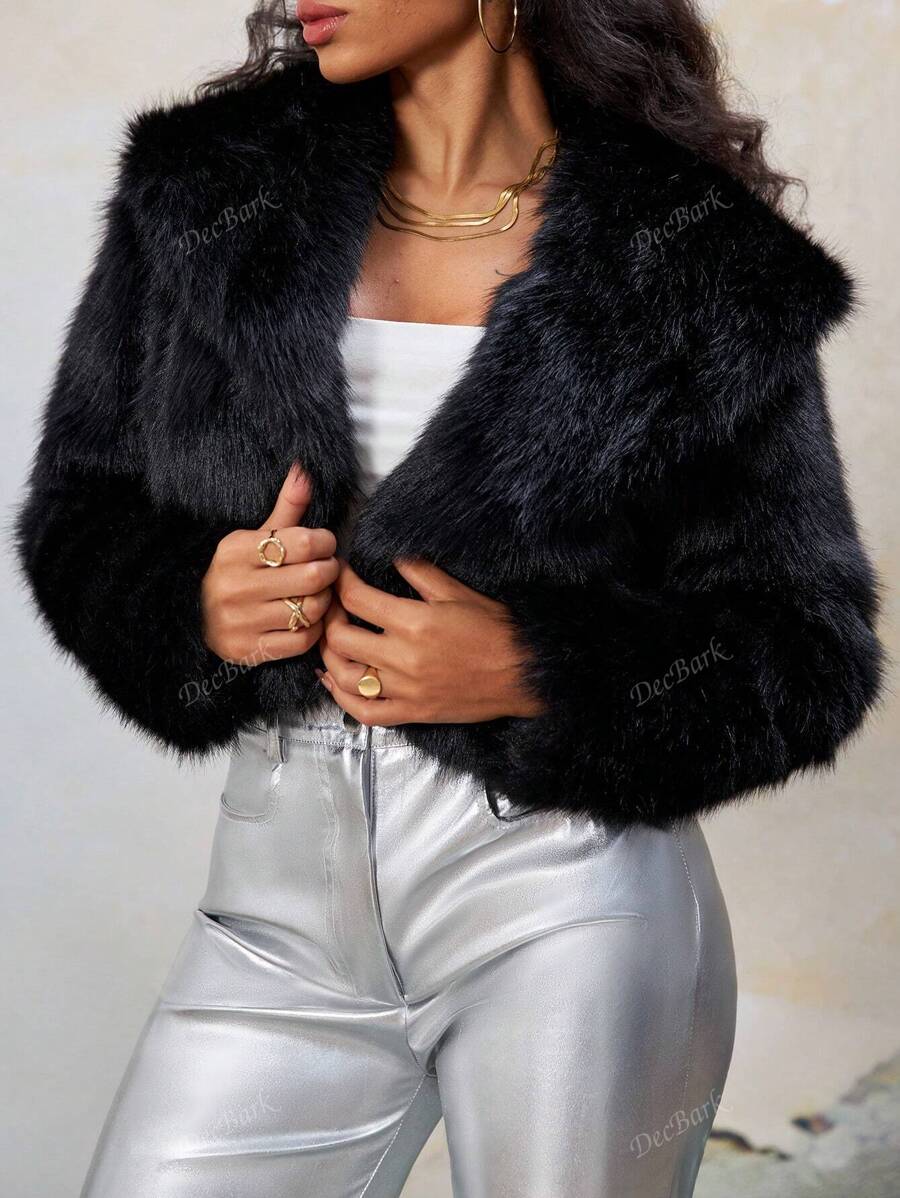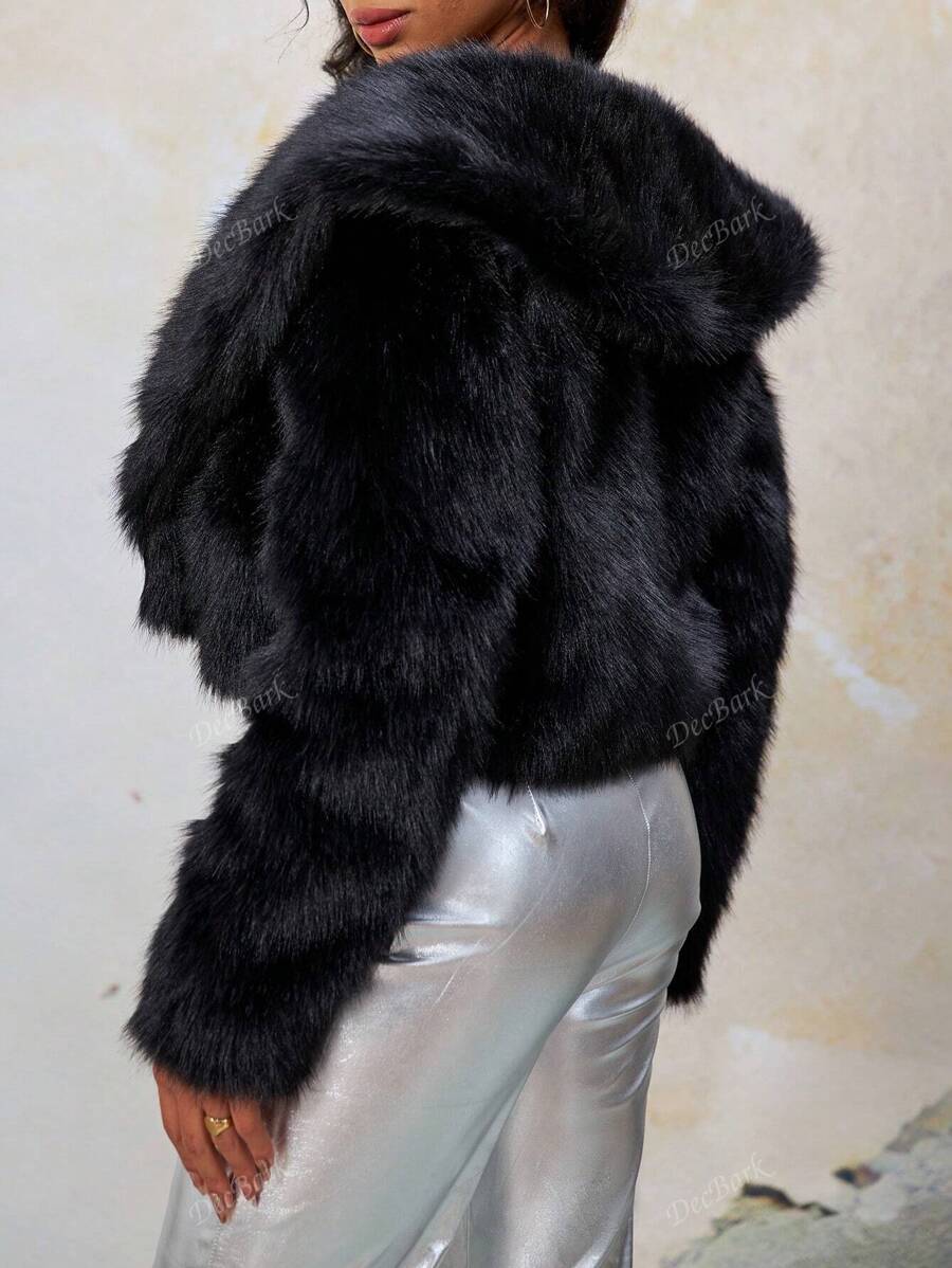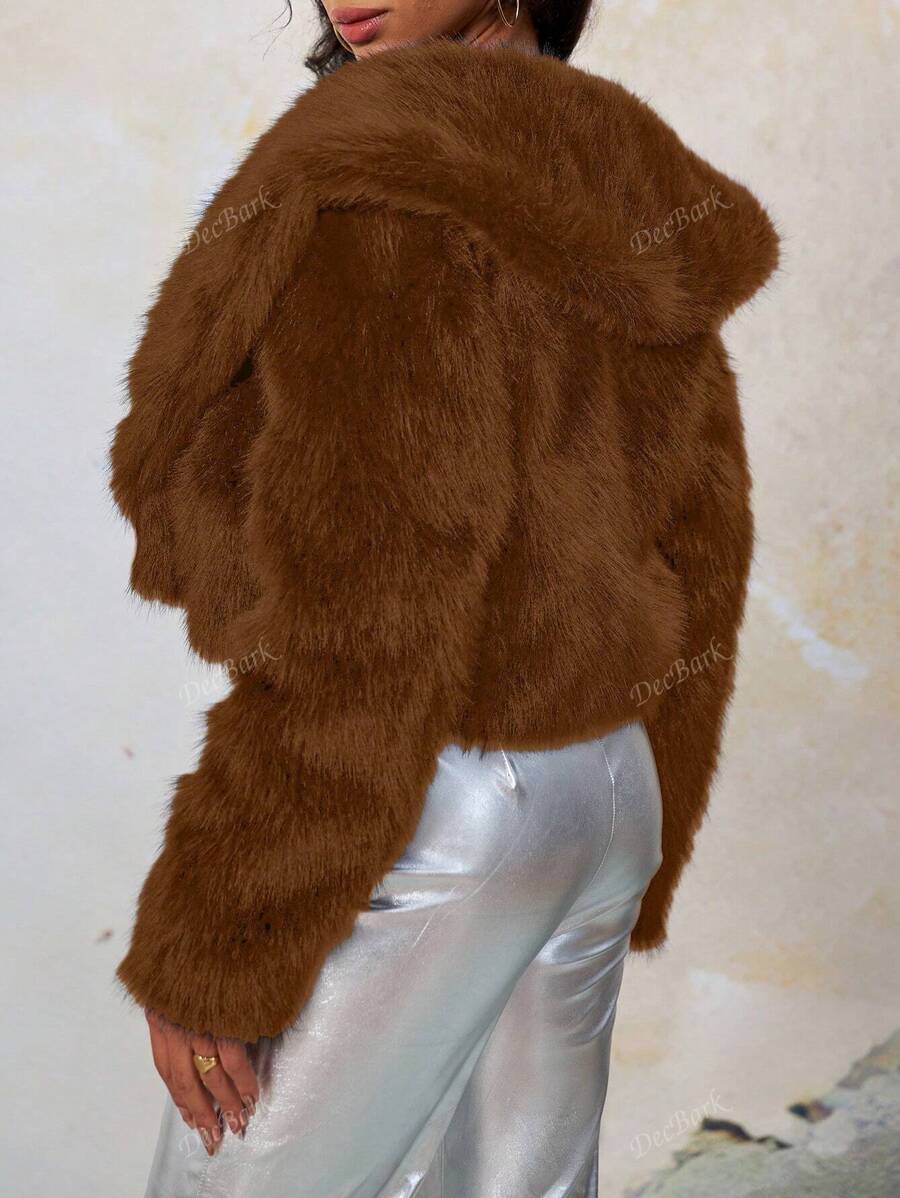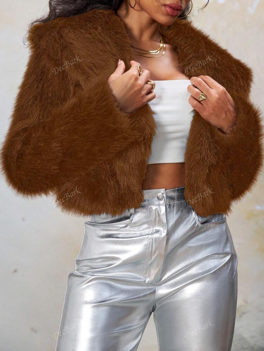 Kratki kaput od umjetnog krzna u jednobojnoj varijanti, s rever kragnom i otvorenim prednjim dijelom