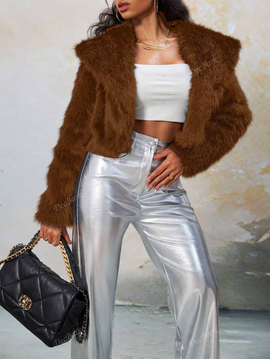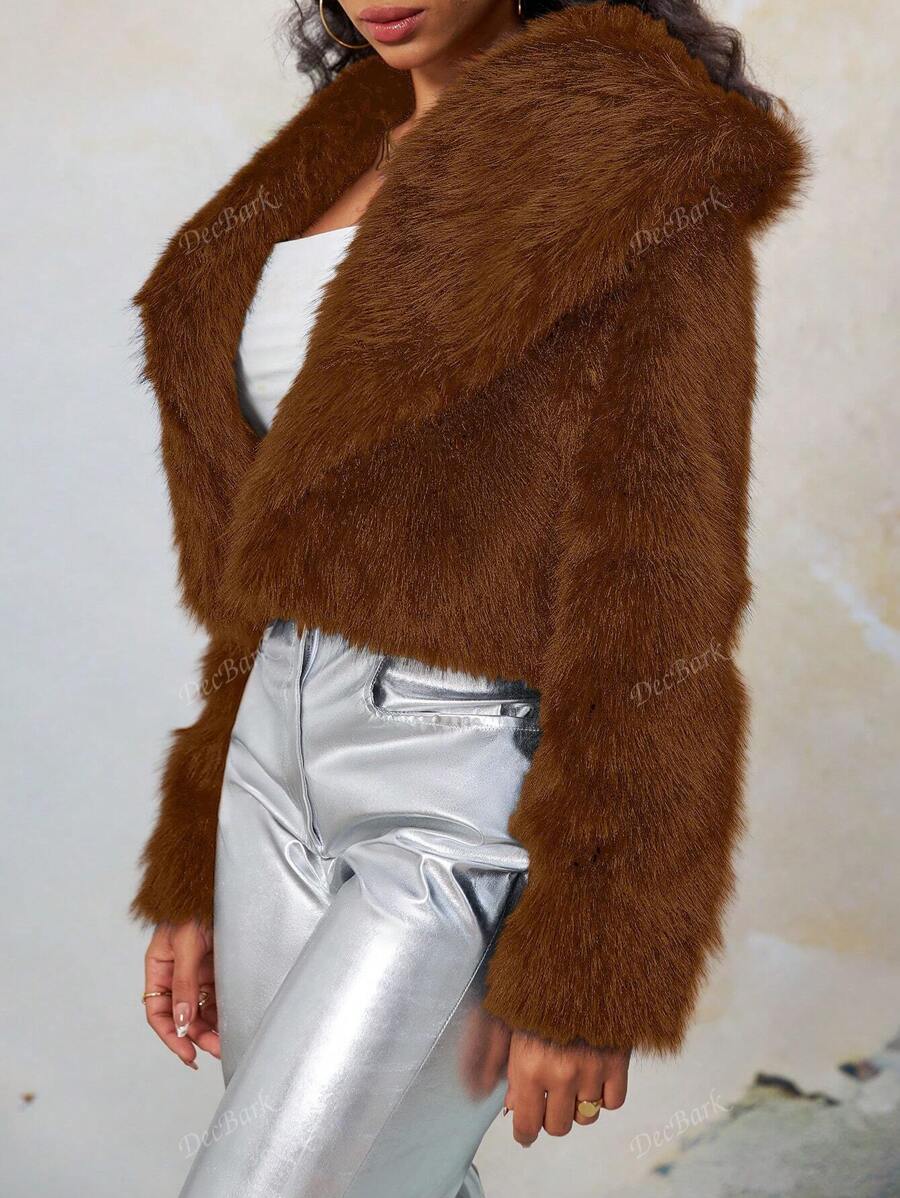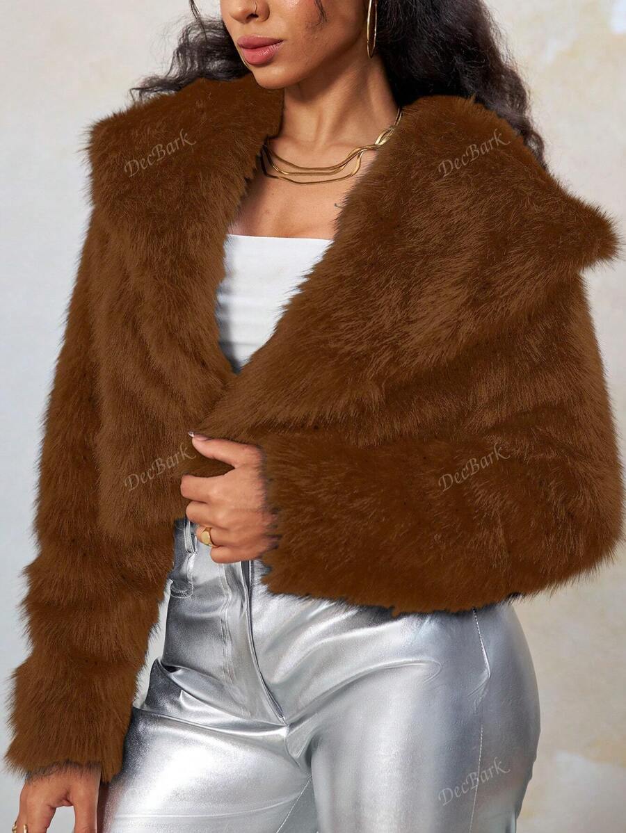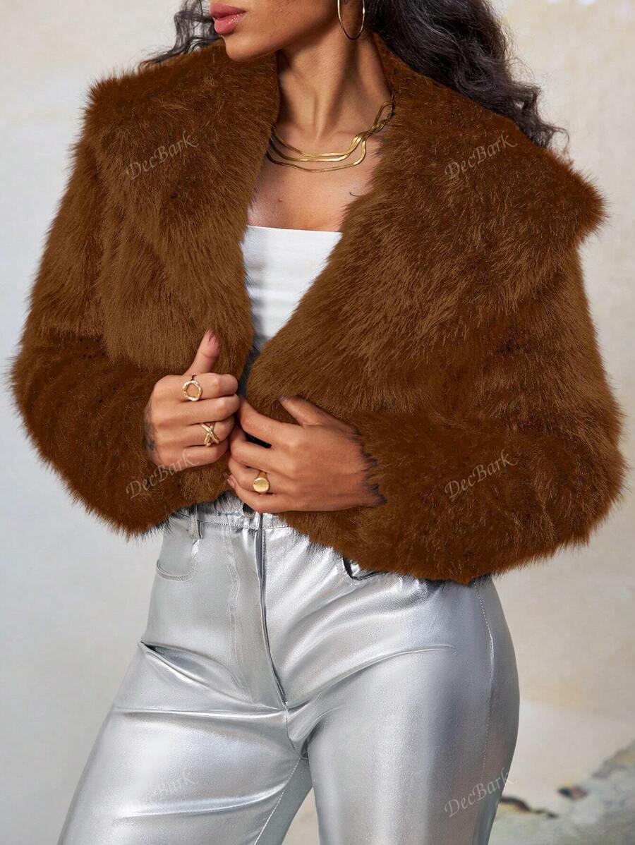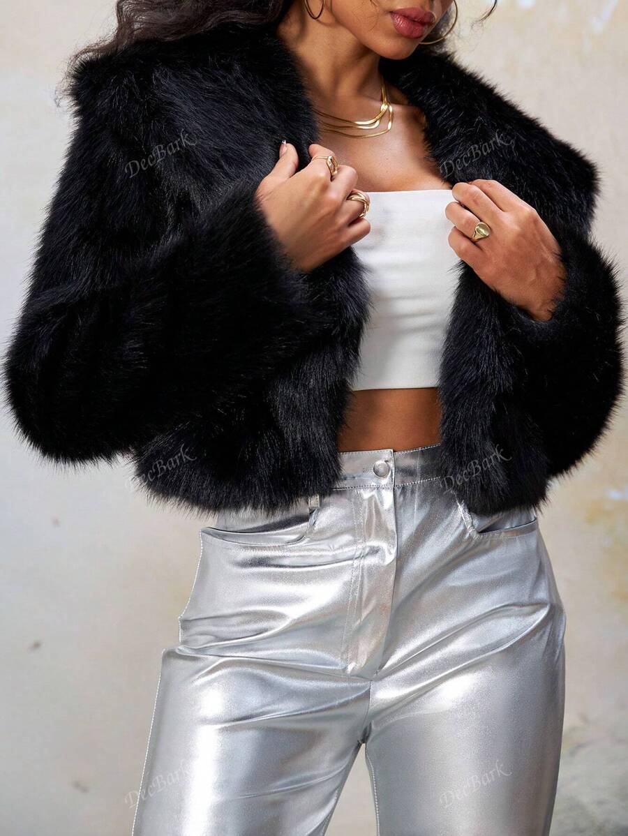 Kratki kaput od umjetnog krzna u jednobojnoj varijanti, s rever kragnom i otvorenim prednjim dijelom