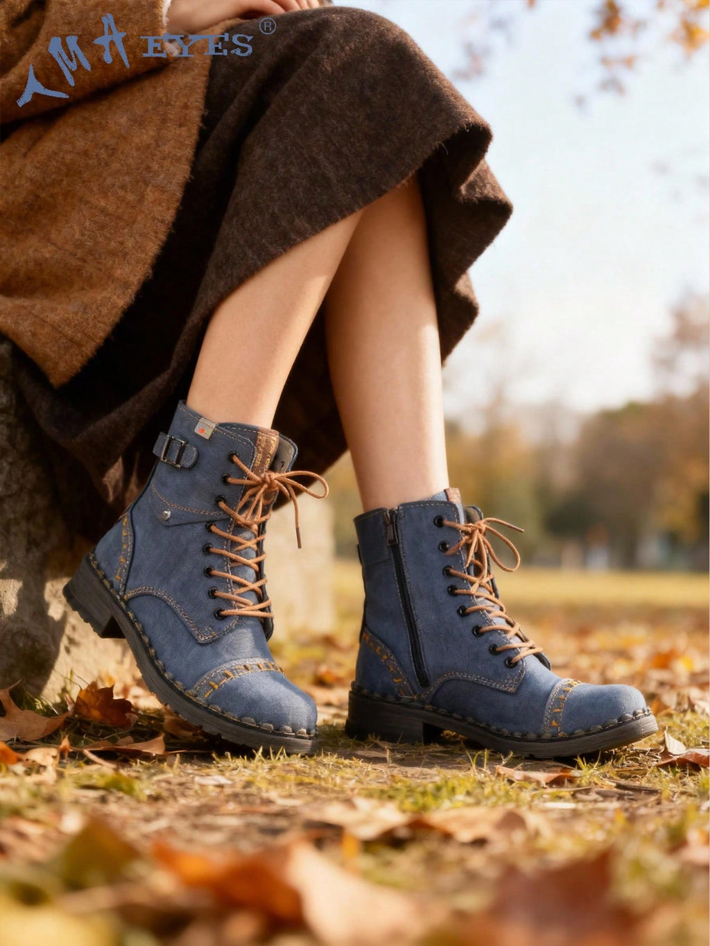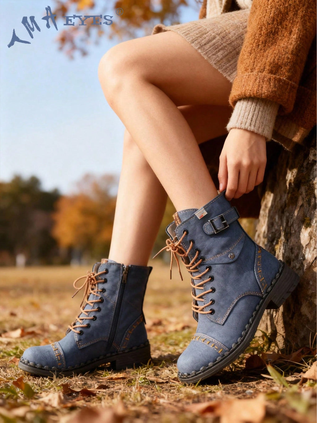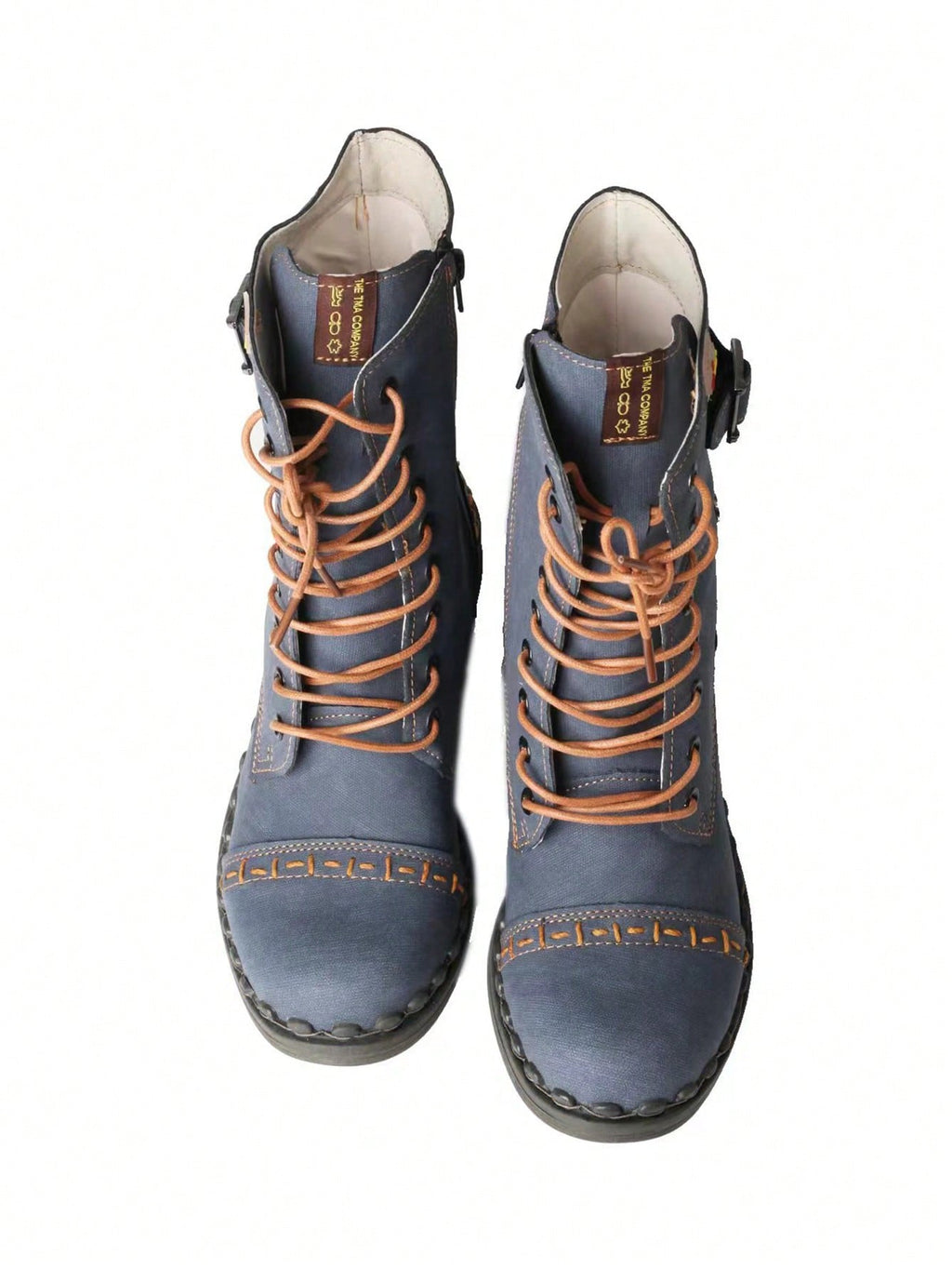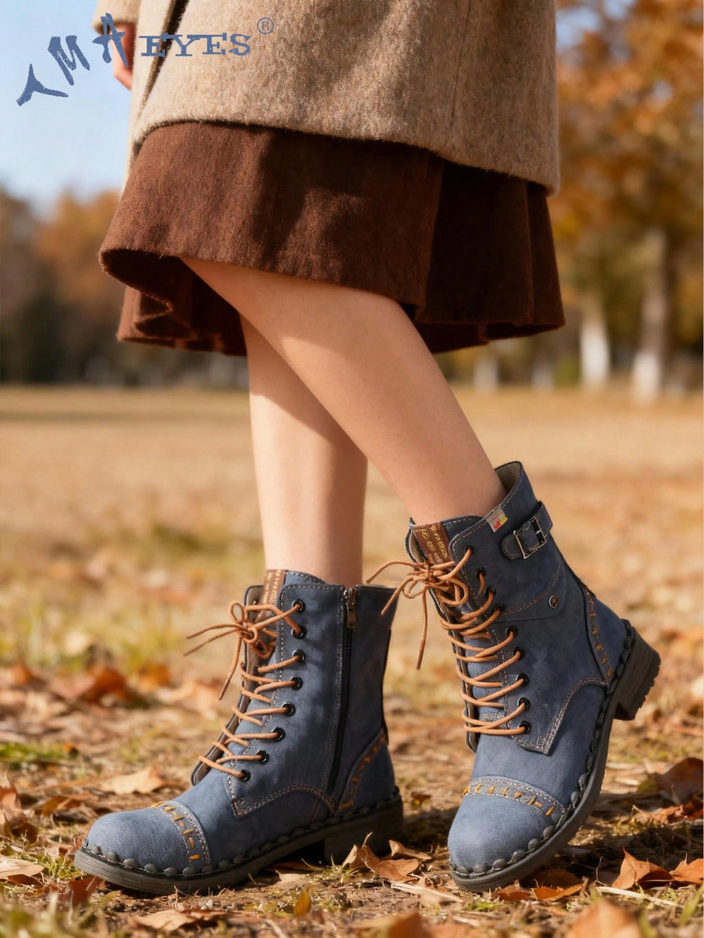 TMA EYES 1 Par TMA EYES Ženske Modne Ankle Čizme, Prava Koža, PU Postava, Metalna Kopča, Masažni Uložak, Voskirane Šnure, Kontrastno Šivanje, Protivklizni Izdržljivi Debeli Pet, Bočna Rajsferšlus za Lako Oblačenje/Skidanje, Udobne Casual Čizme Povećanih
