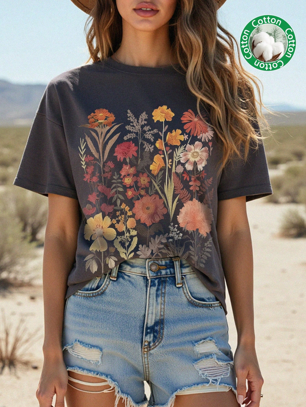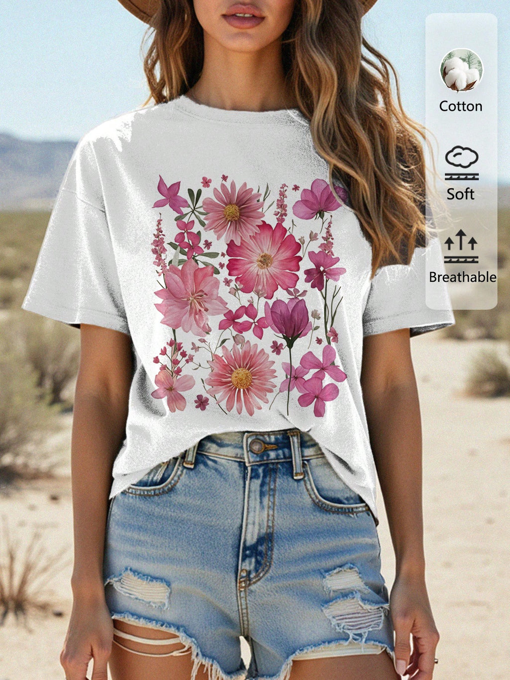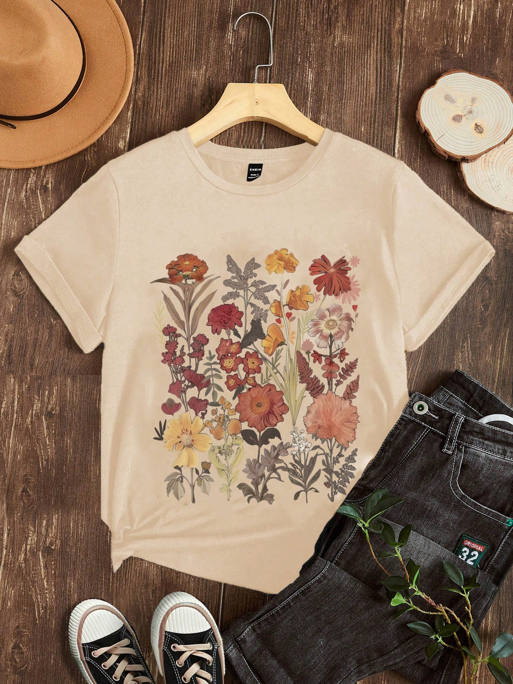 Tseoso ležerna pamučna majica kratkih rukava s okruglim izrezom i cvjetnim grafikom, uski kroj za žene, pogodna za ljeto, prirodna
