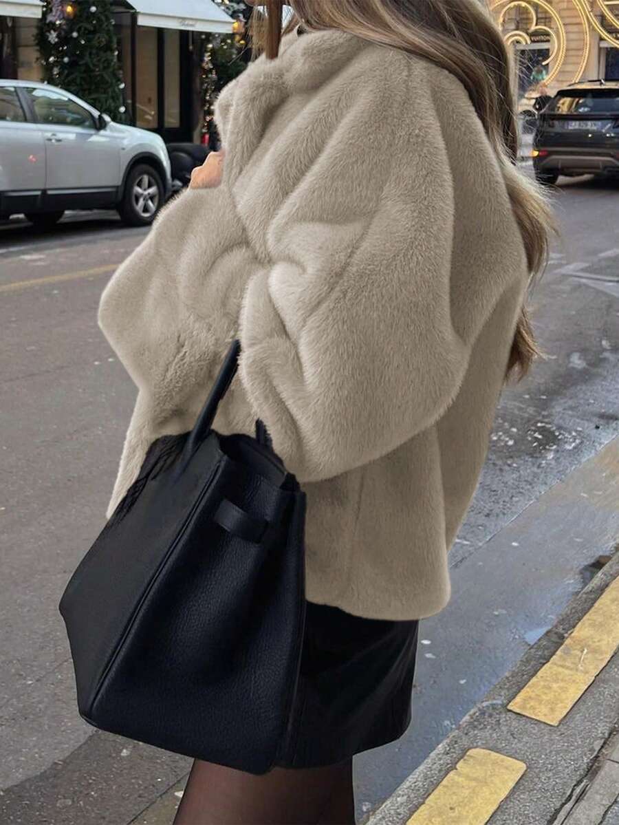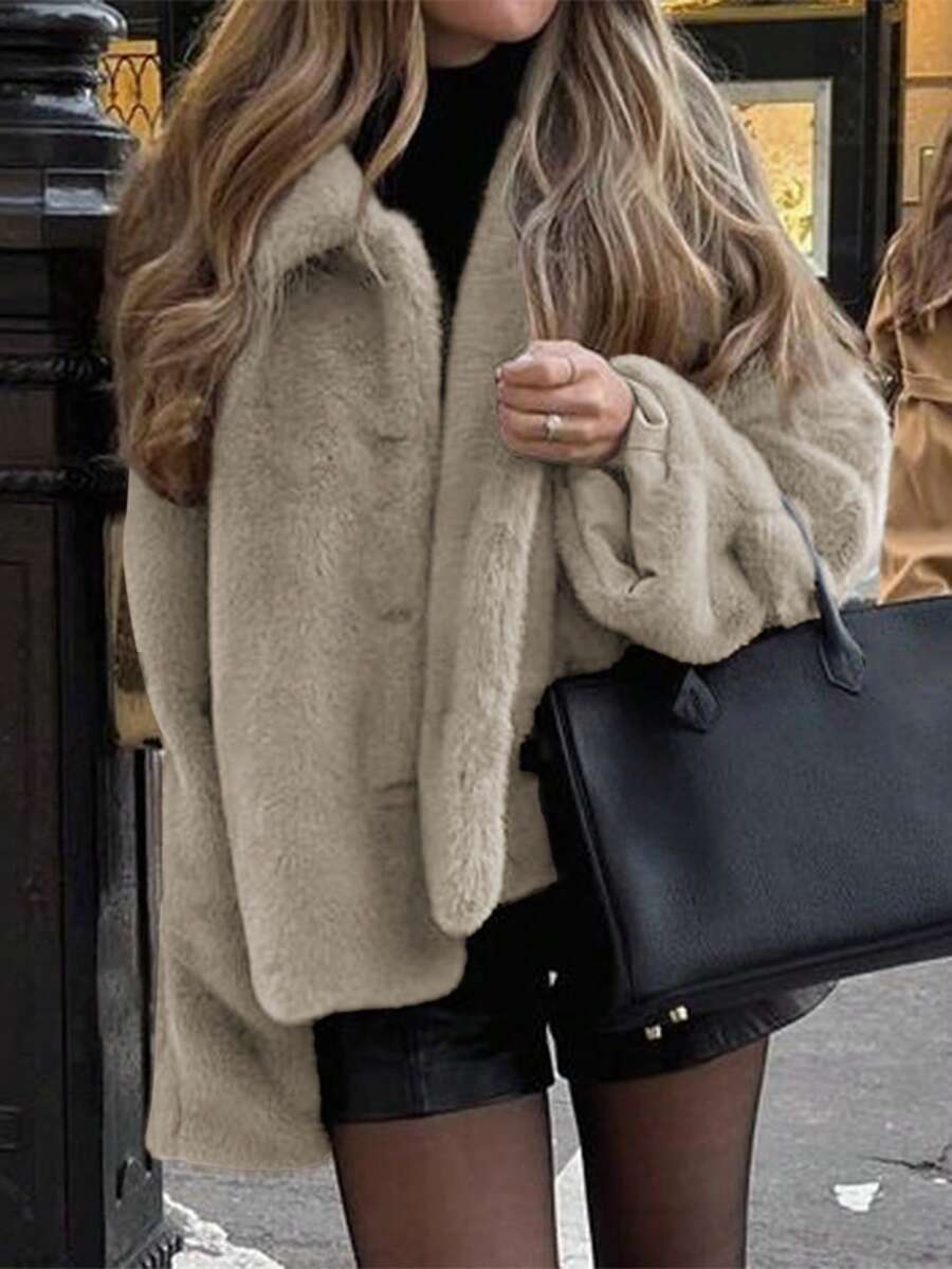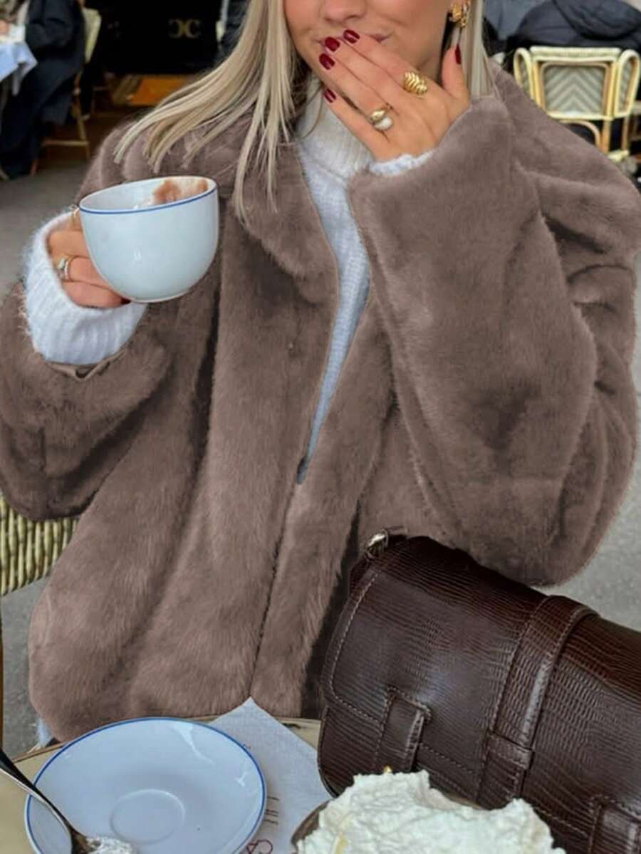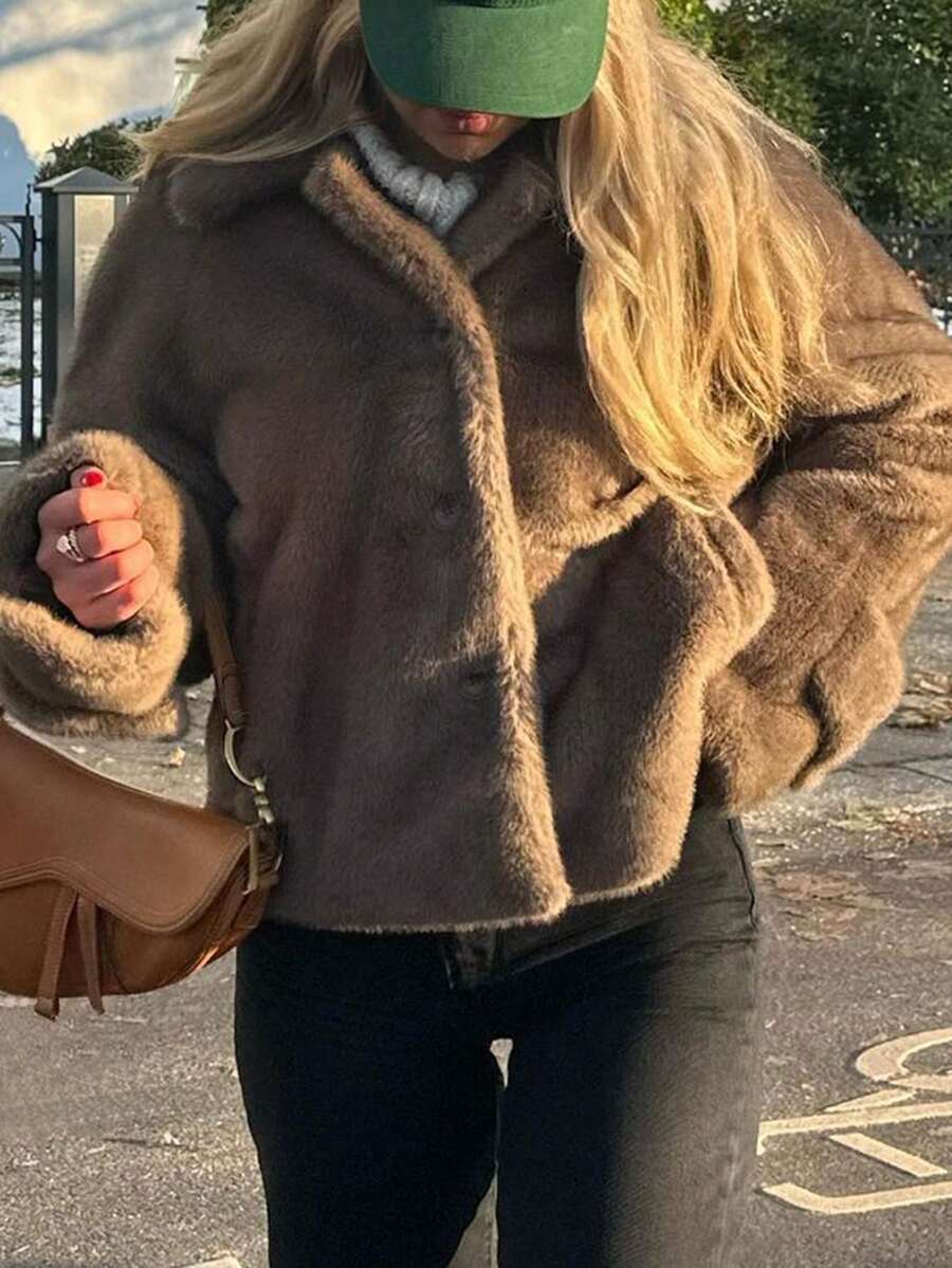 Zimska ženska odjeća u retro stilu – dugi kardigan s dugim rukavima od smeđeg umjetnog krzna, idealan za hladne dane