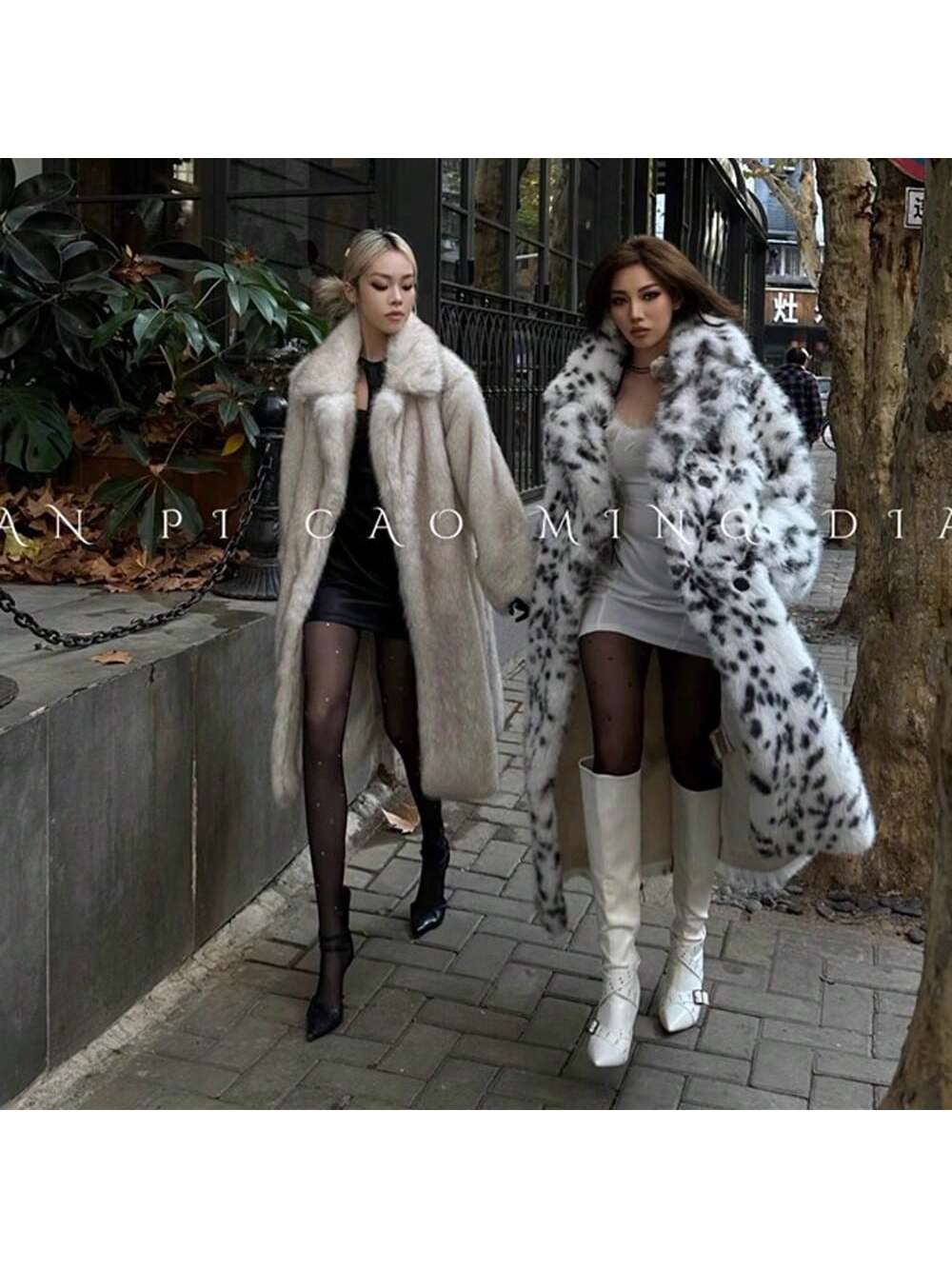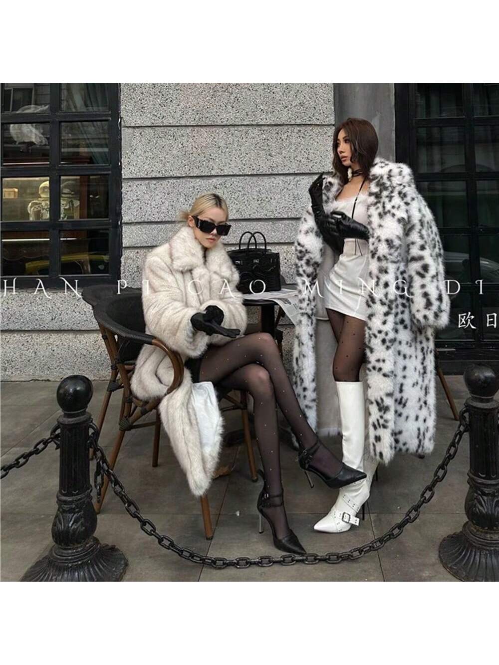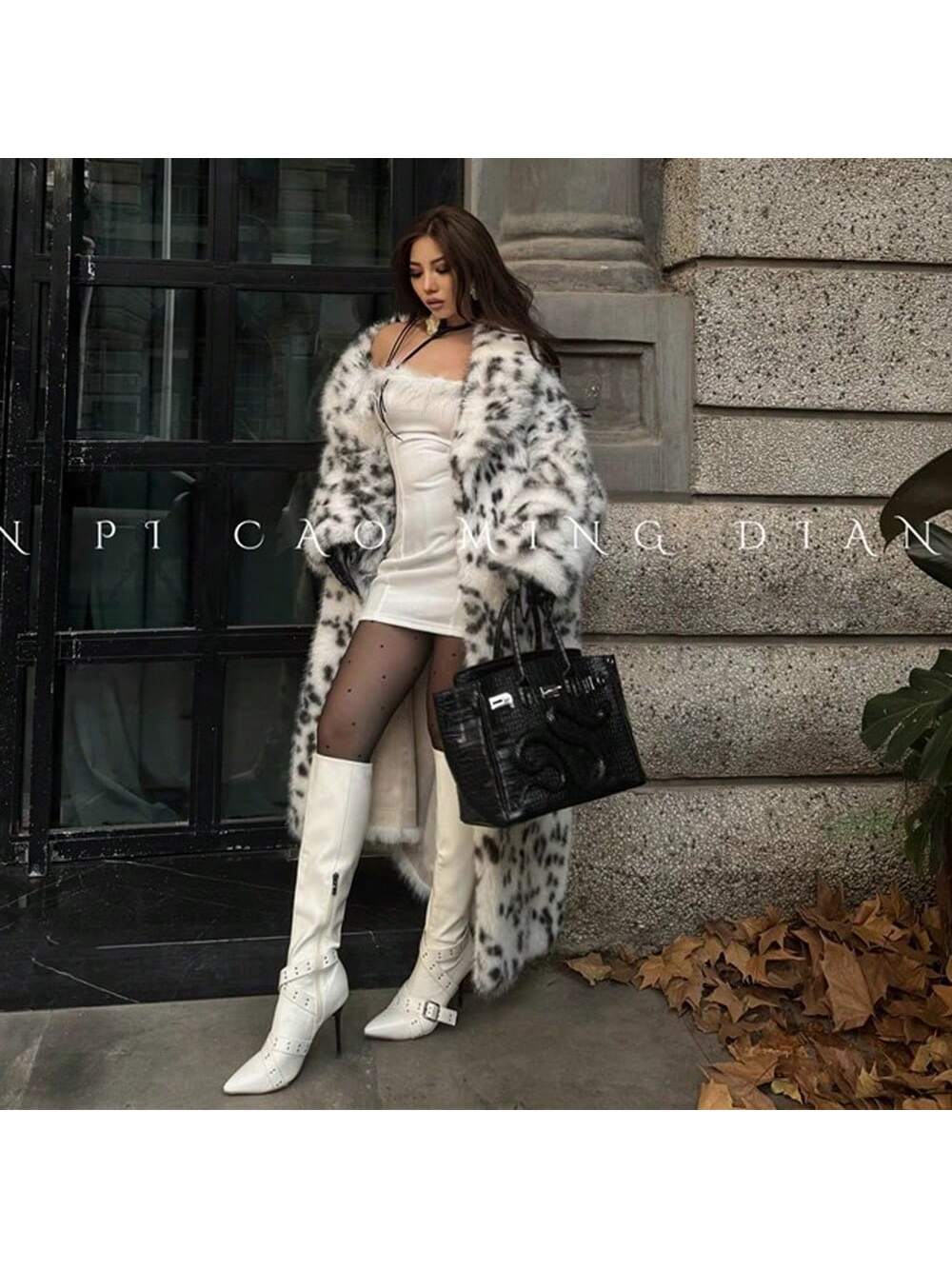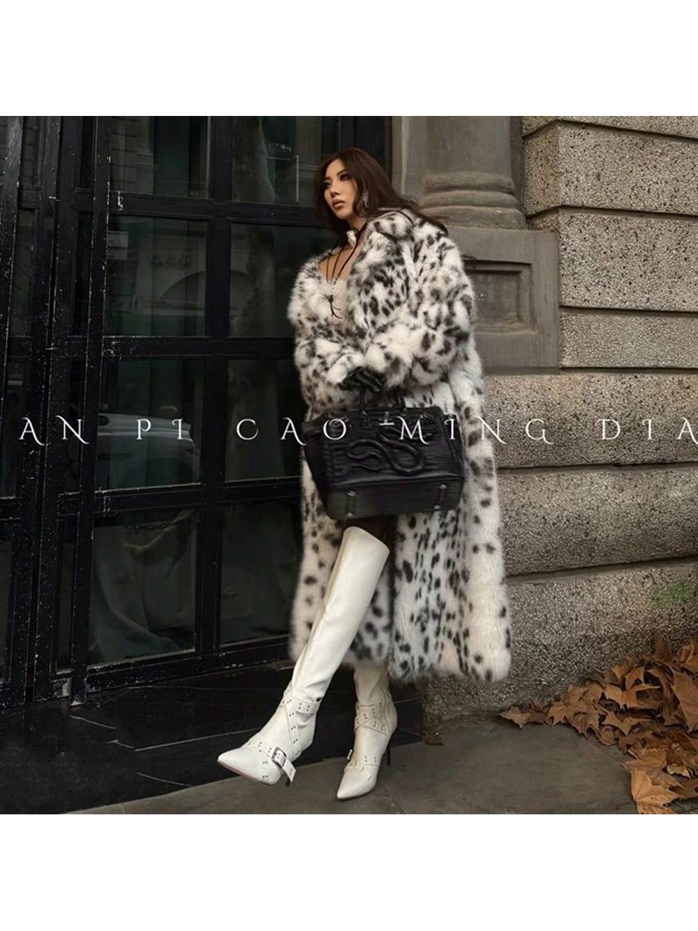 Ženski dugi kaput od umjetnog krzna s leopard ili ris uzorkom, ukrašen debelom kragnom od umjetnog lisićeg krzna