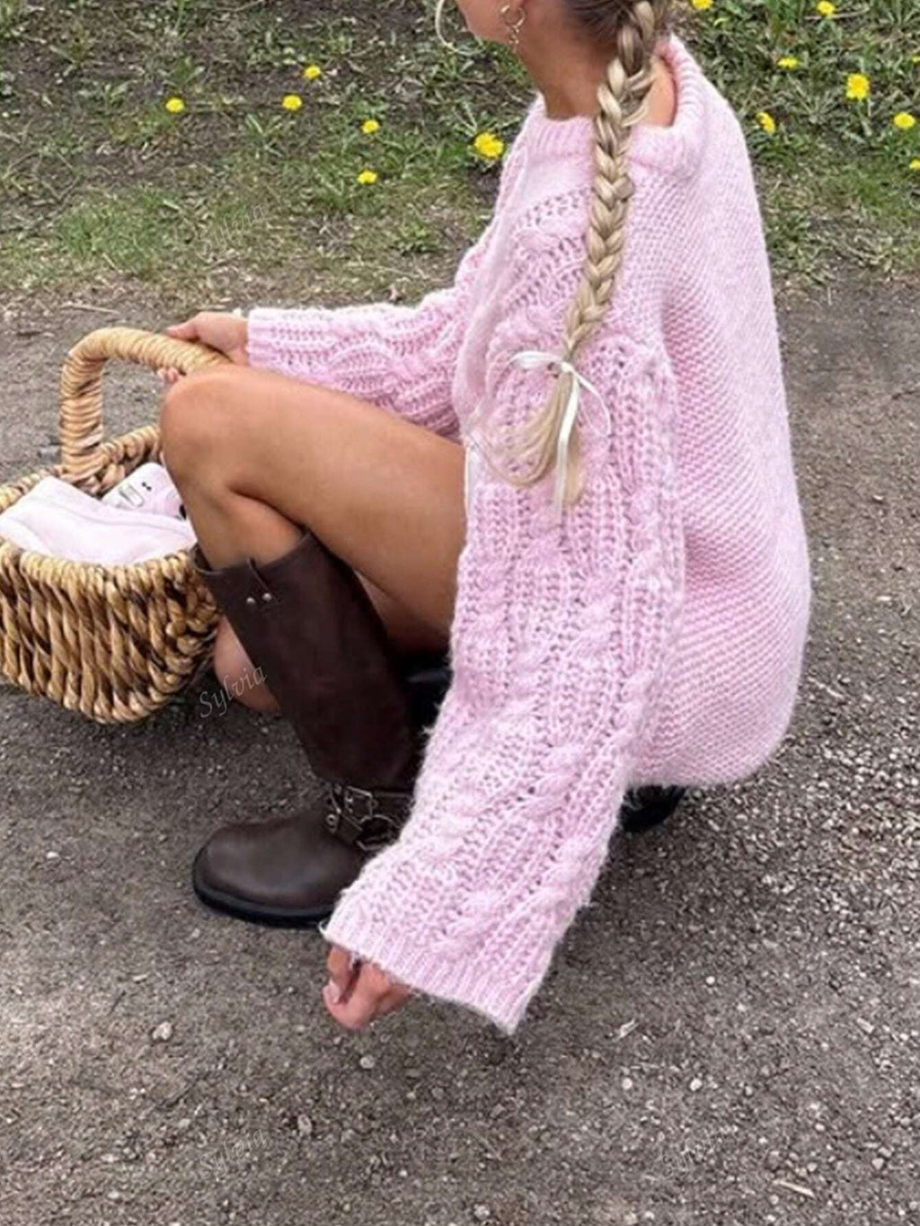 Women's Solid Color Knitted Cable Knit Sweater, Casual Autumn/Winter