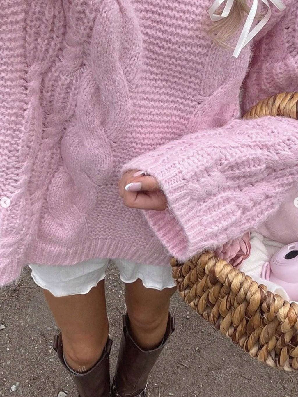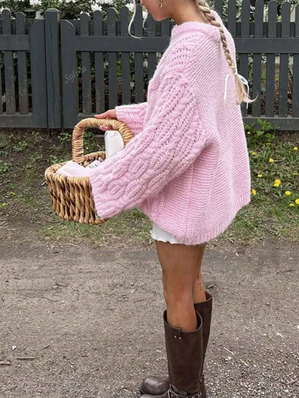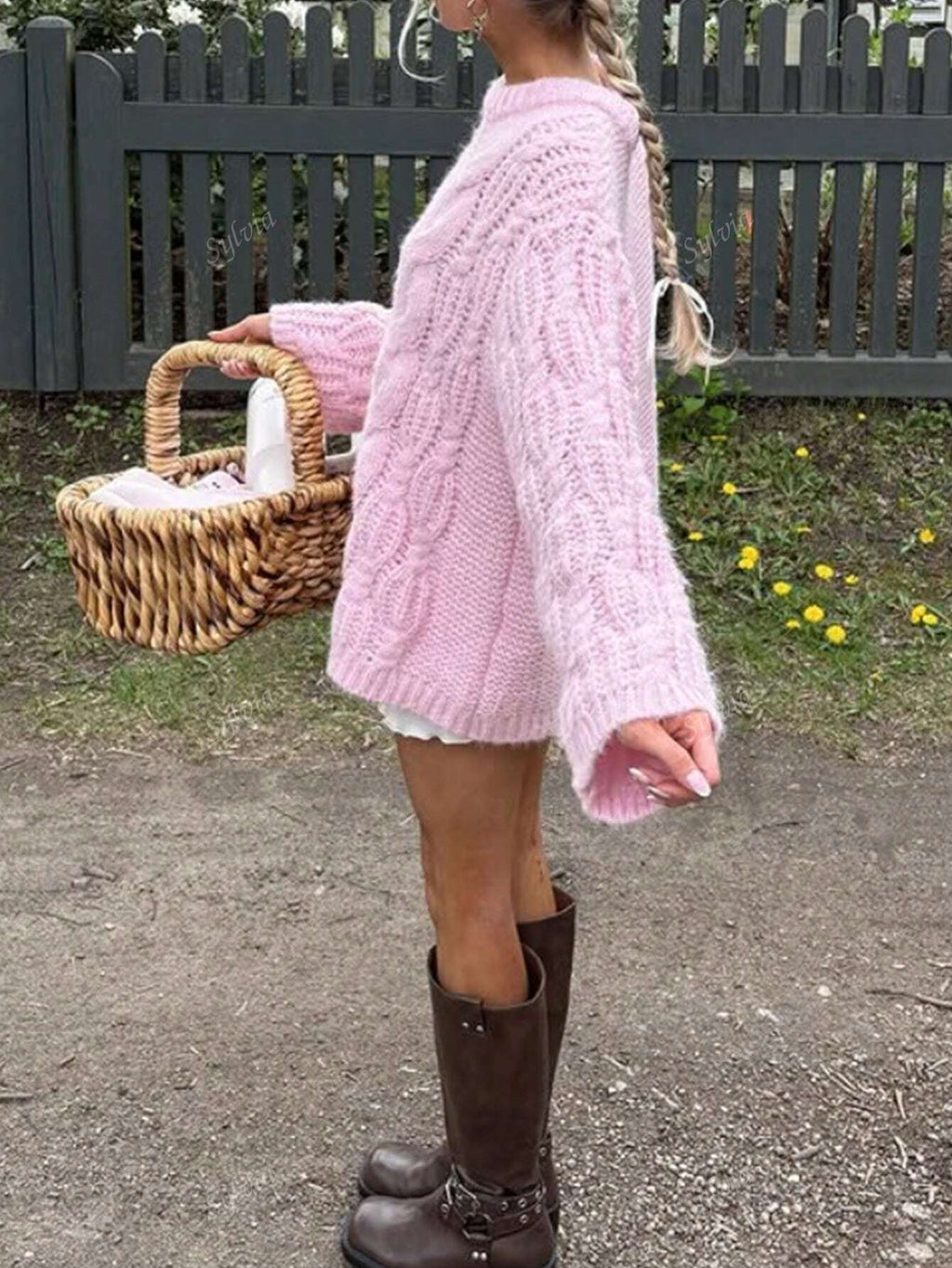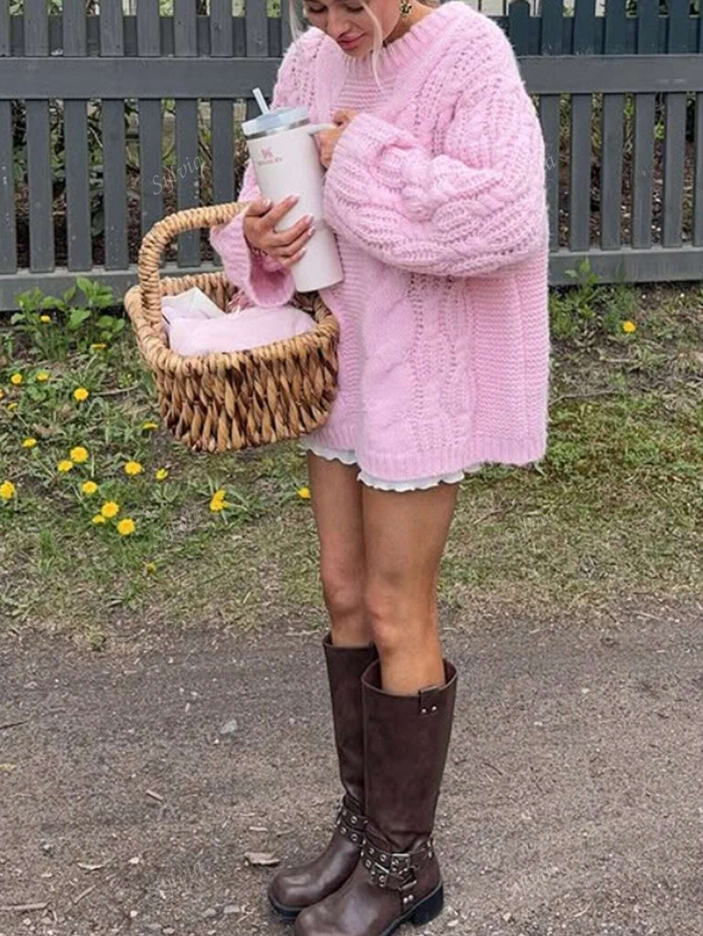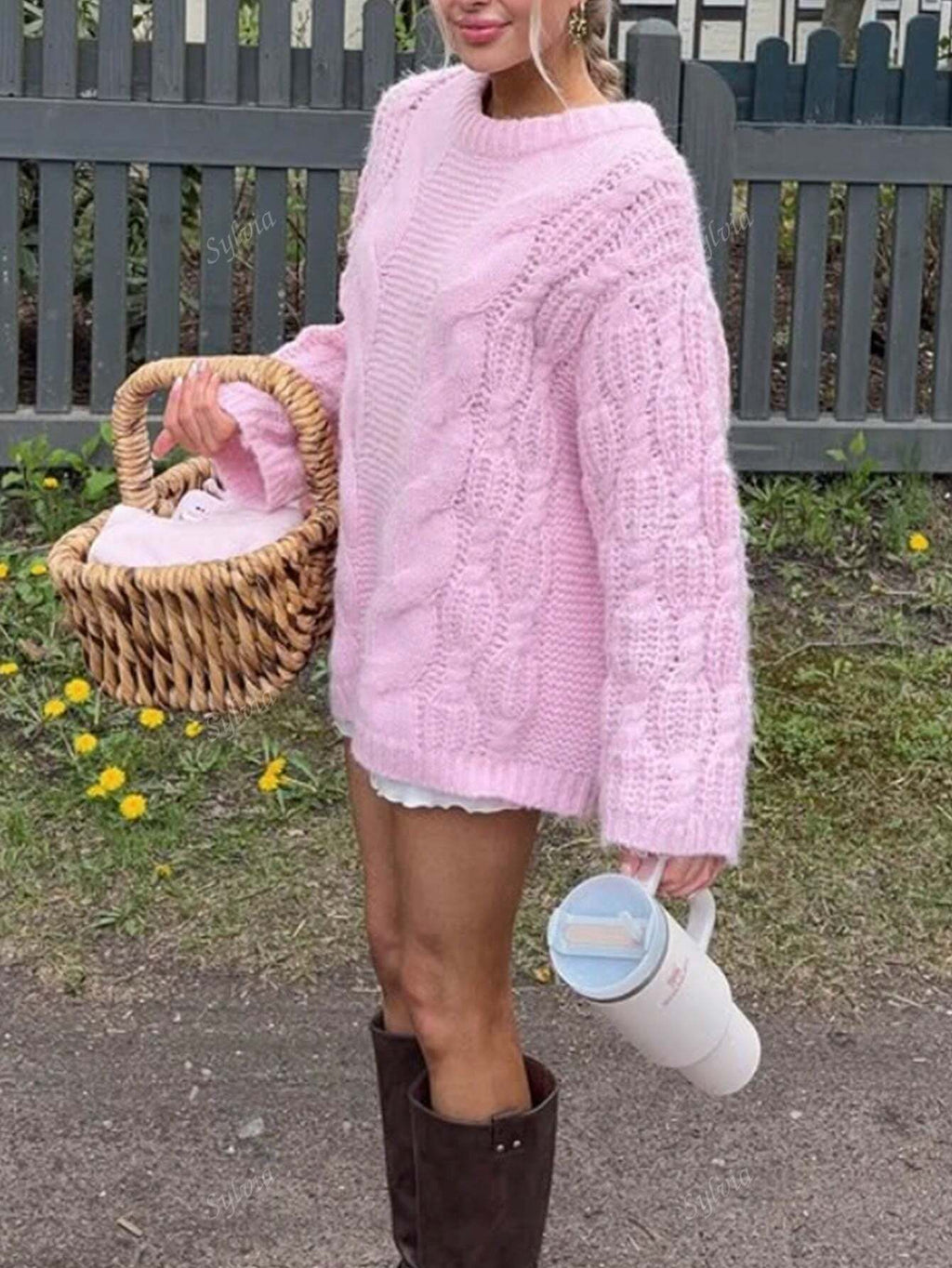 Women's Solid Color Knitted Cable Knit Sweater, Casual Autumn/Winter