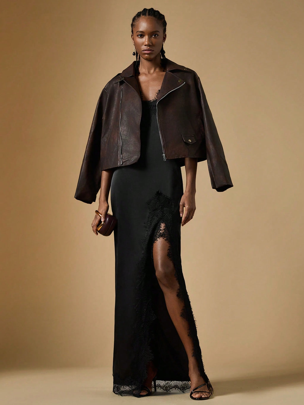 MIU AZRA Ženska Crna Crep Haljina sa Nabranom Ovratnikom i Rukavima u Zvonu