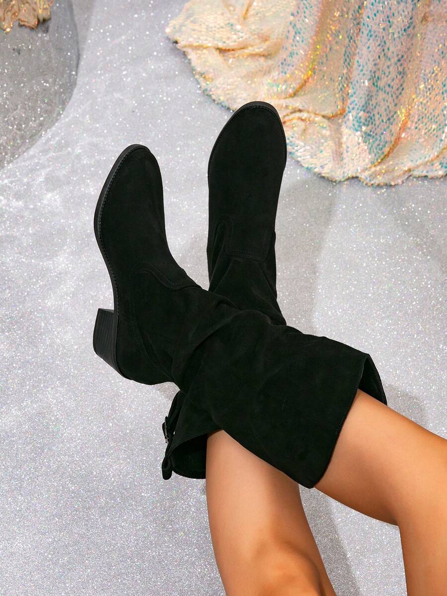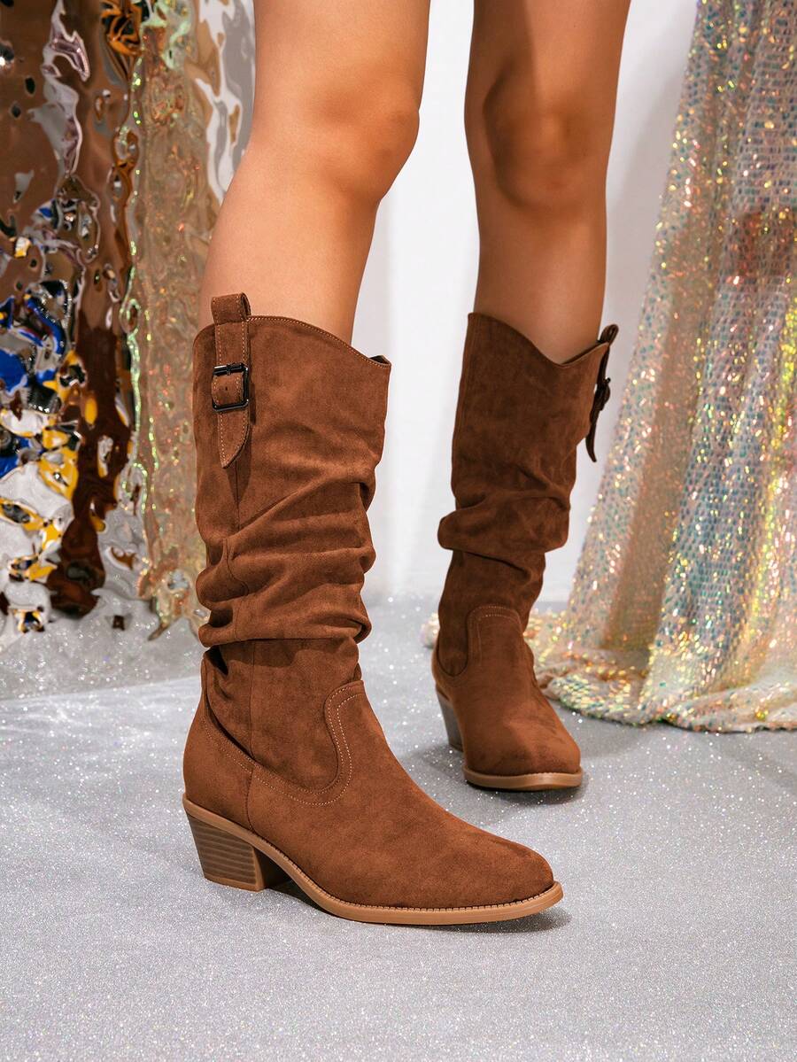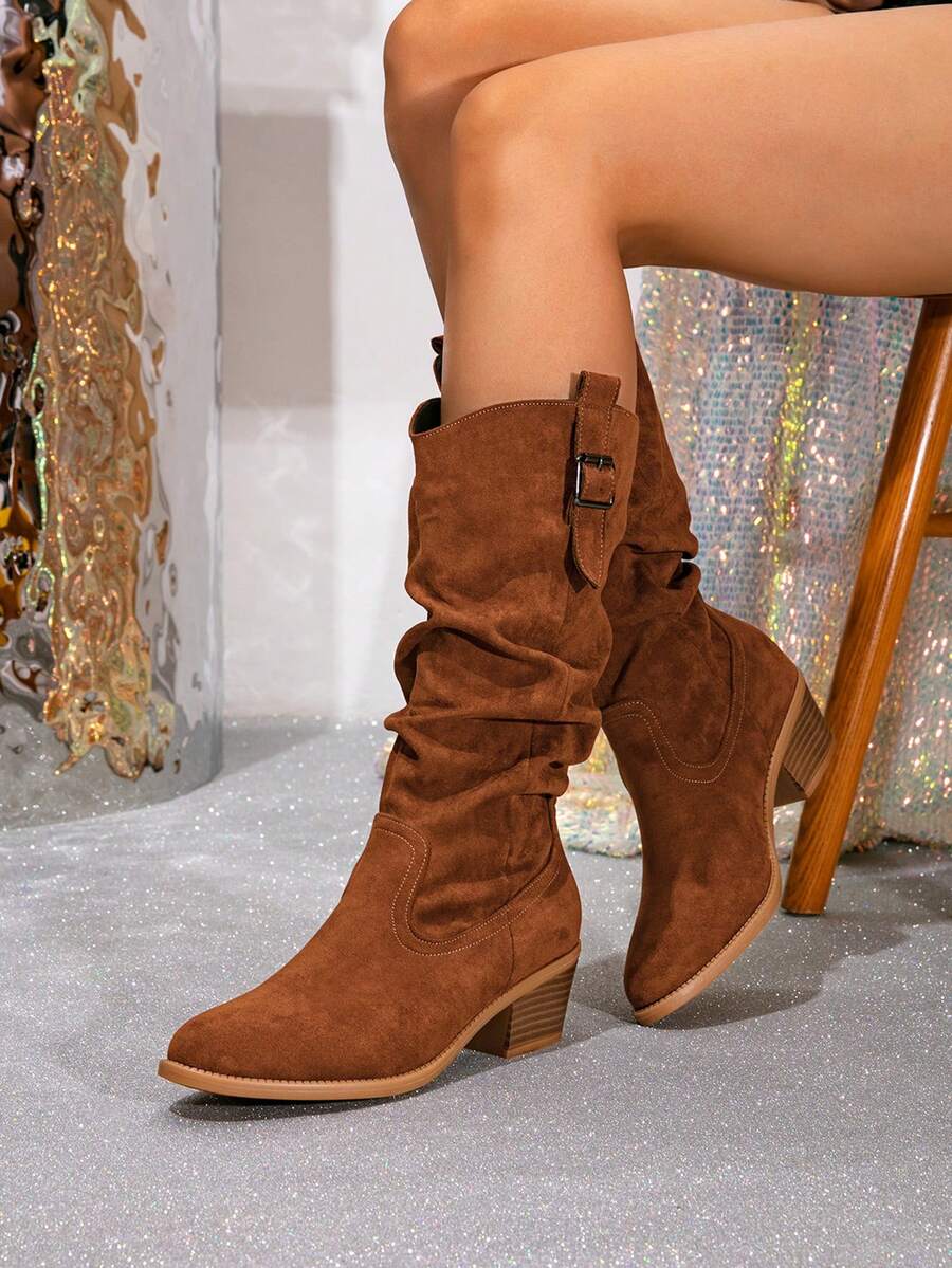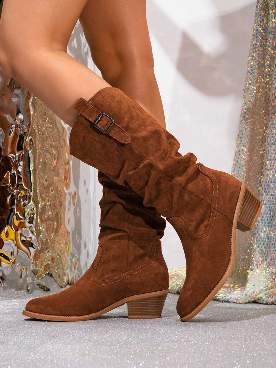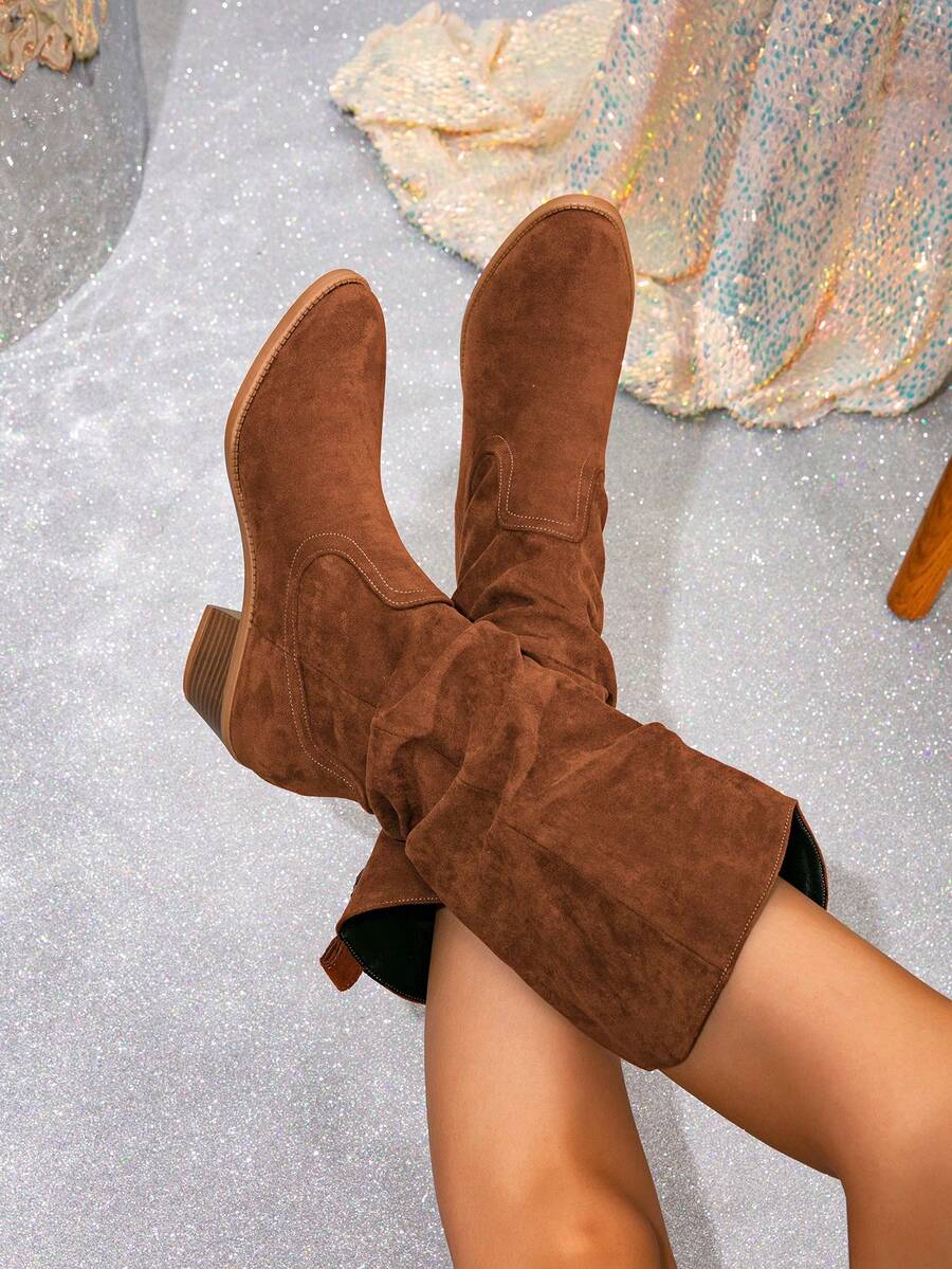 Ženske čizme do sredine lista - Zapadnjački stil sa bočnim patentnim zatvaračem - Pokrivene čizme za jesen/zimu sa debelim potpeticama od suède - Evropske čizme sa okruglim prstima, debelim potpeticama, proklizavajućim, uskim dugim čizmama - Udobne čizme
