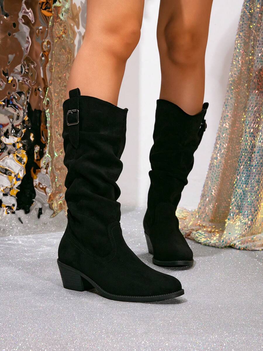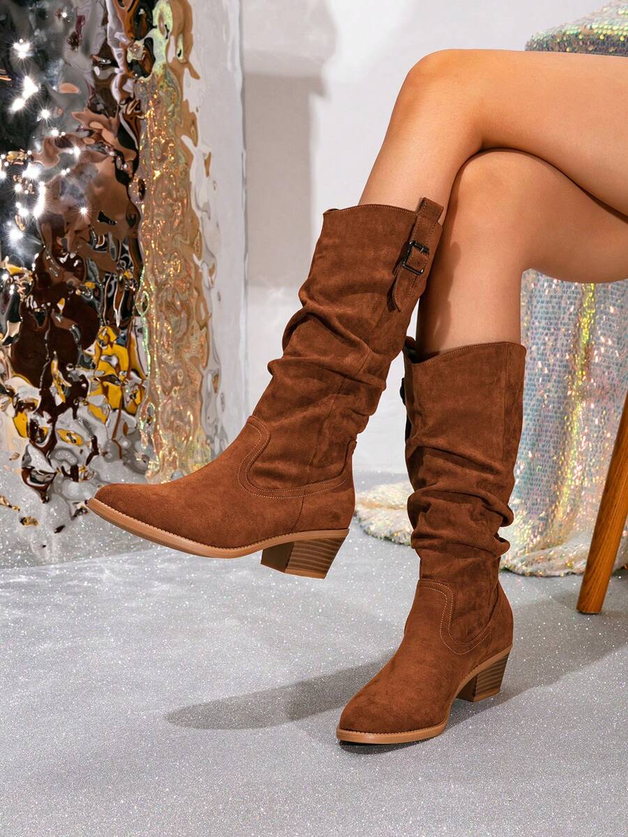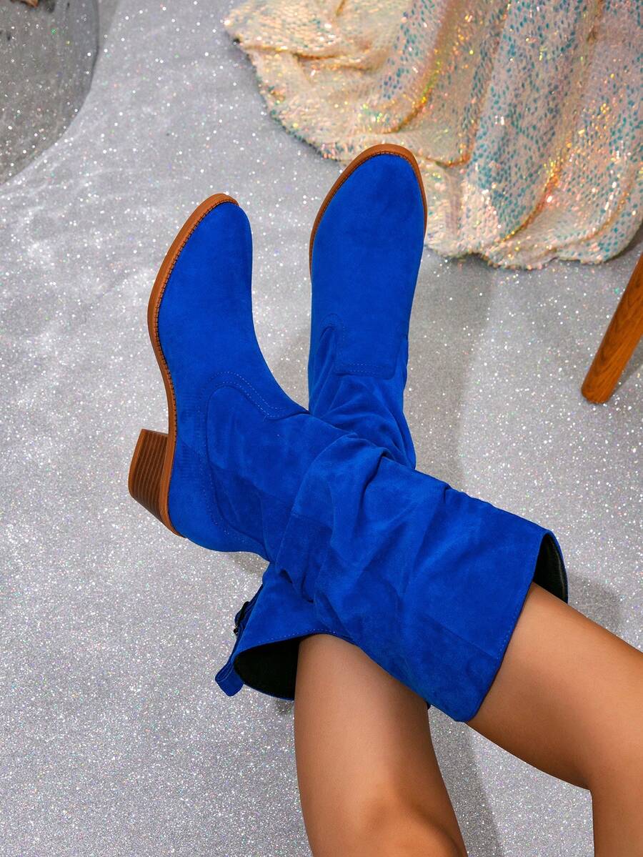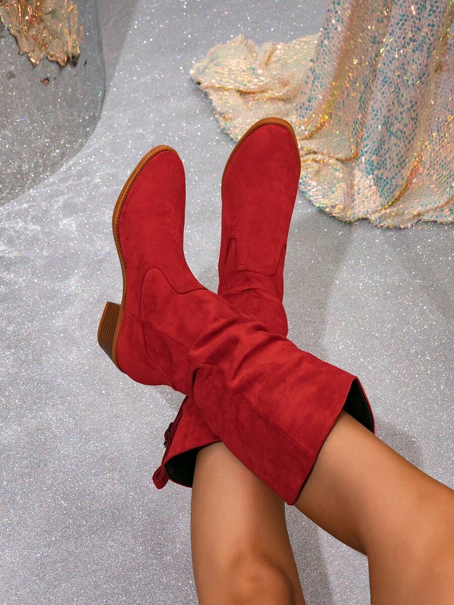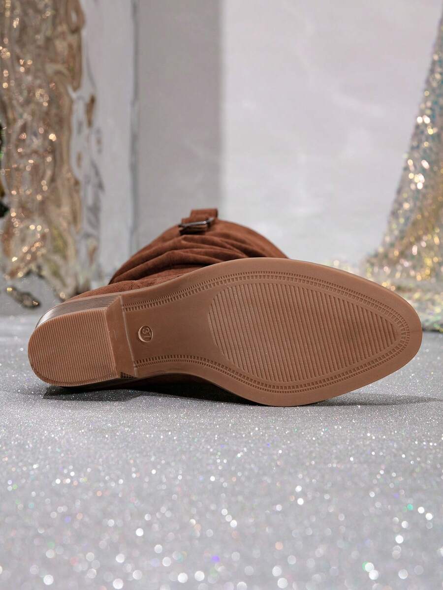 Ženske čizme do sredine lista - Zapadnjački stil sa bočnim patentnim zatvaračem - Pokrivene čizme za jesen/zimu sa debelim potpeticama od suède - Evropske čizme sa okruglim prstima, debelim potpeticama, proklizavajućim, uskim dugim čizmama - Udobne čizme