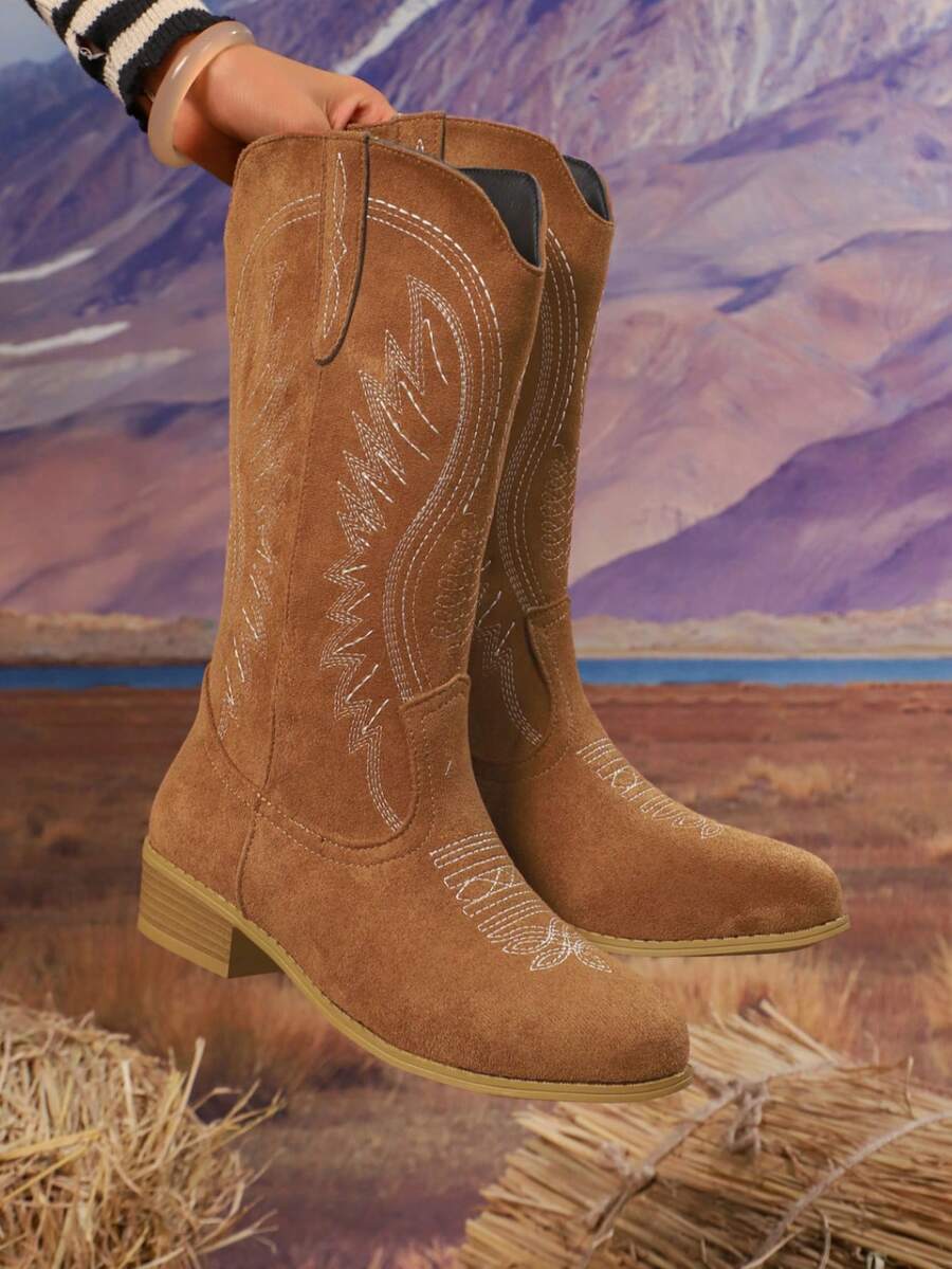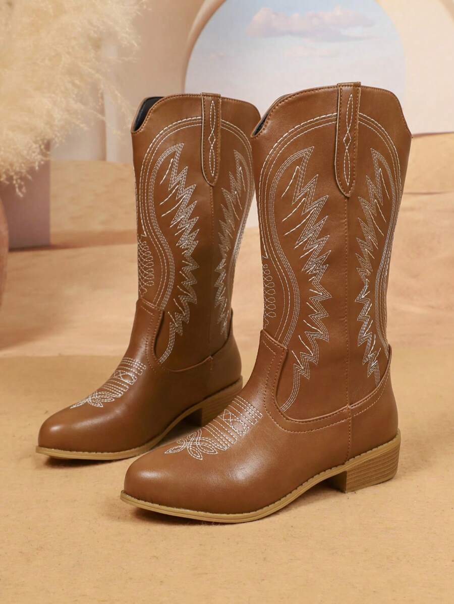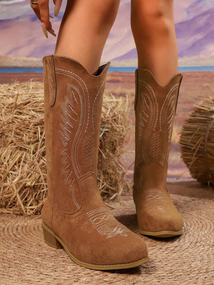 Ženske smeđe kožne vintage vezene zapadnjačke čizme, modni svestrani čizme sa okruglim đonom, retro zrele stilizovane kaubojke
